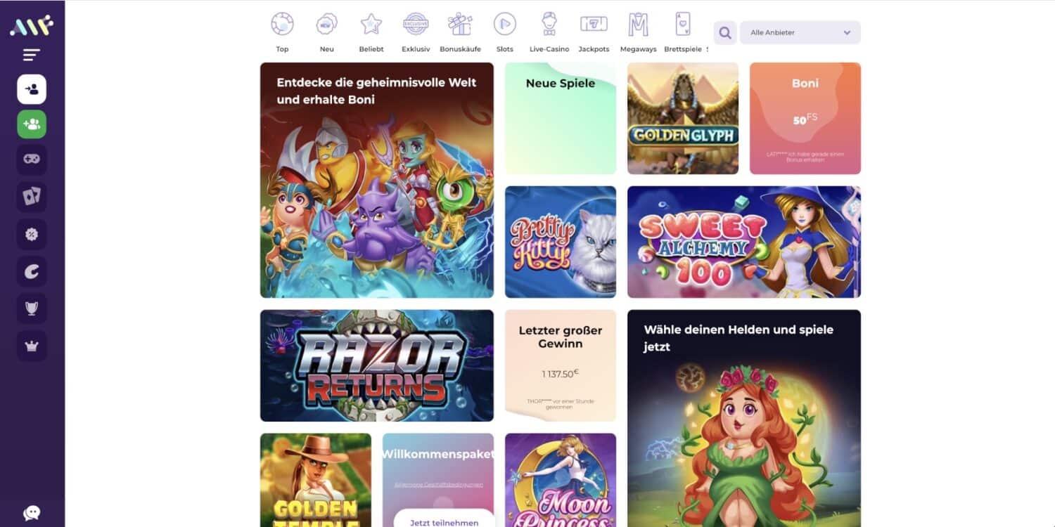 Das Alf Casino ist ein wahres Paradies für Glücksspielfans. Mit einer beeindruckenden Auswahl von über 10.000 Casinospielen von mehr als 110 renommierten Softwareentwicklern bietet es eine schier endlose Vielfalt an Unterhaltung. Namhafte Hersteller wie Merkur, NetEnt, Pragmatic Play, Microgaming und Gamomat sorgen für eine Spielqualität auf höchstem Niveau.