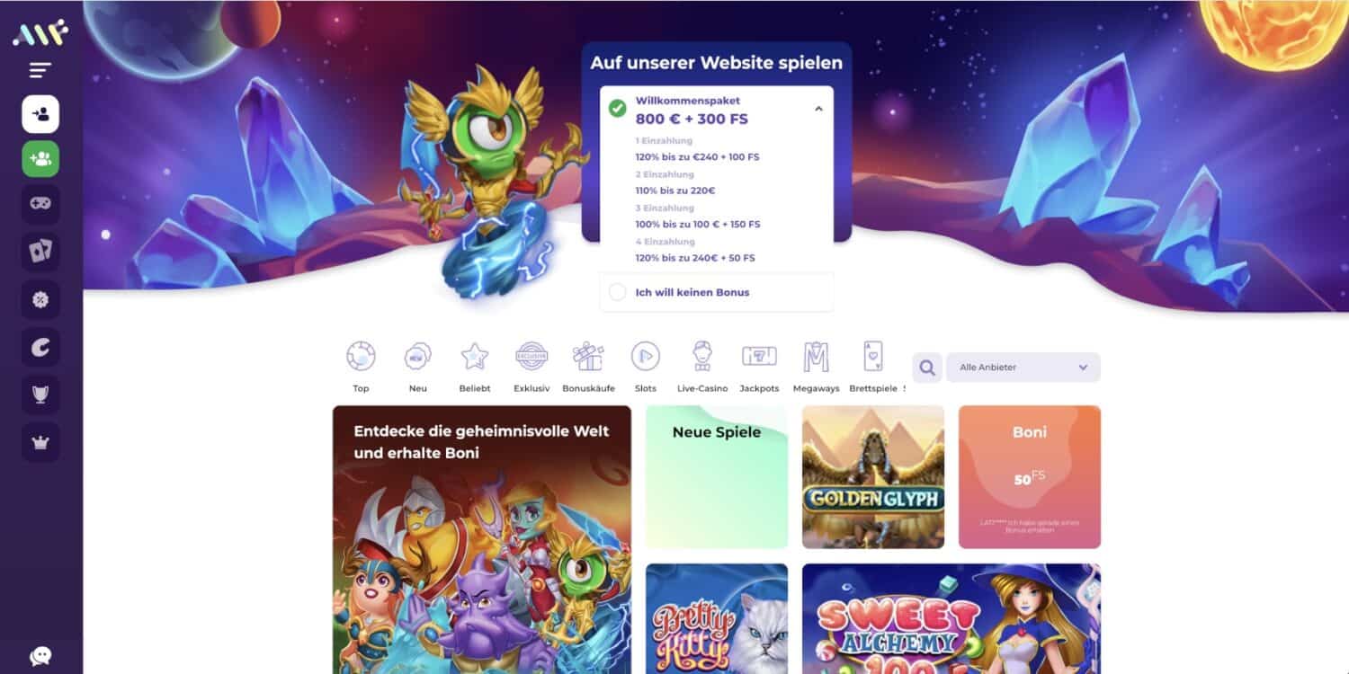 Neukunden dürfen sich auf ein großzügiges Willkommenspaket freuen: Bis zu 800 Euro Bonus und 300 Freispiele warten darauf, von dir beansprucht zu werden. Dieses Angebot wird clever auf deine ersten vier Einzahlungen verteilt, sodass du lange davon profitierst.