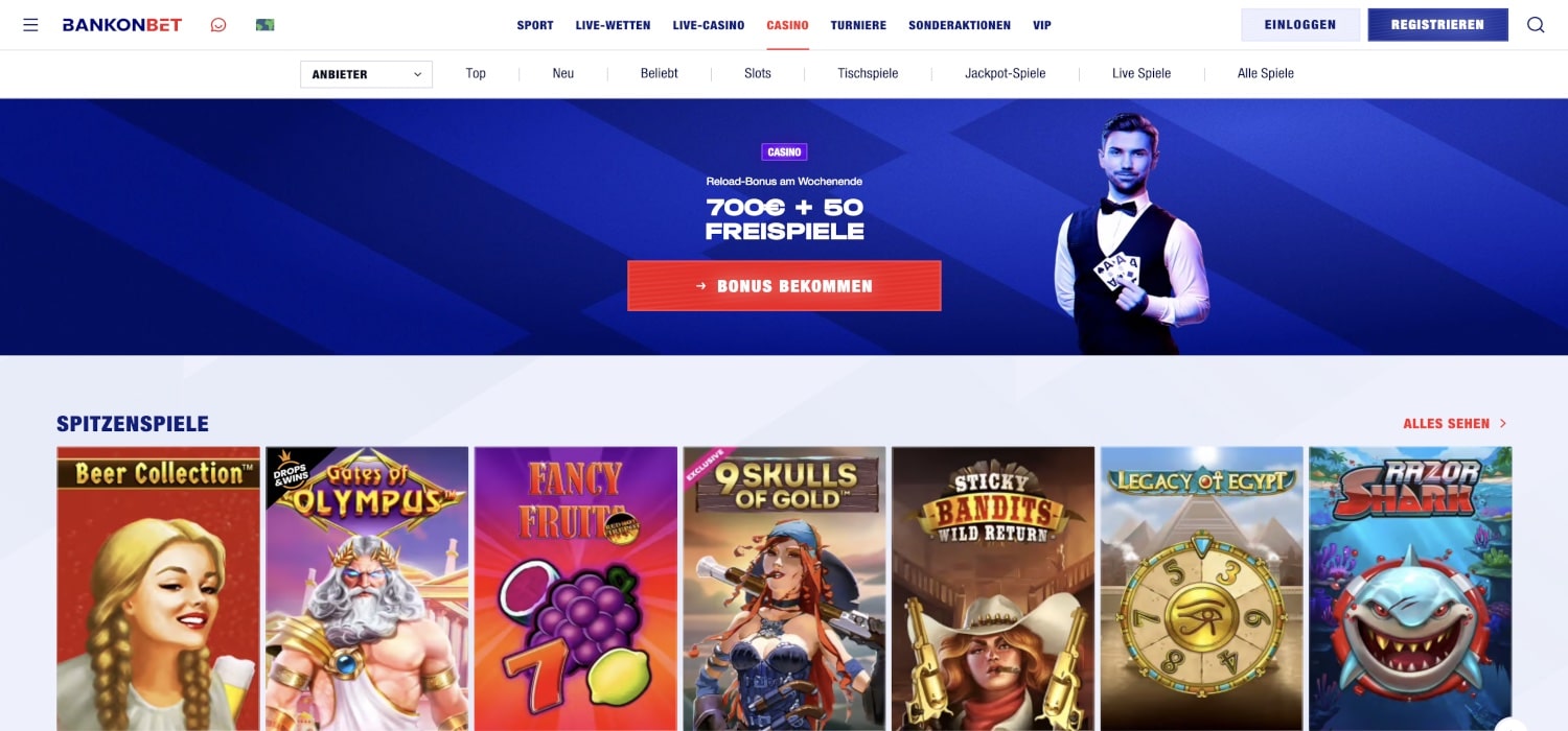 In der Casino-Sektion des Bankonbet Casinos gibt es eine vielfältige Auswahl an Spielmöglichkeiten, einschließlich Spielautomaten, Tischspielen und Live-Casino-Angeboten. Es ist weit verbreitet, dass gerade die Spielautomaten den größten Anteil der Spiele ausmachen, wie bei vielen anderen Websites auch. Daher sind sie auch das am meisten gespielte Spiel.