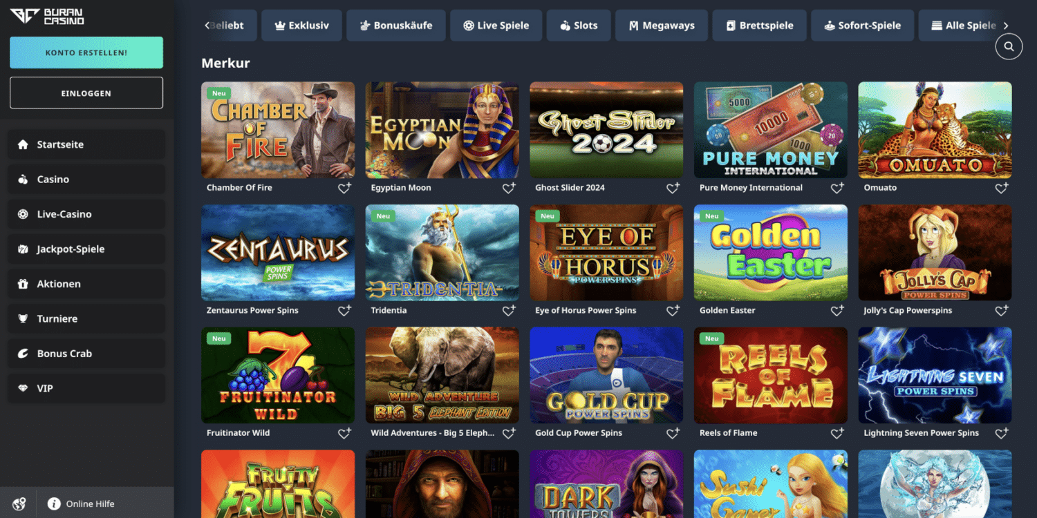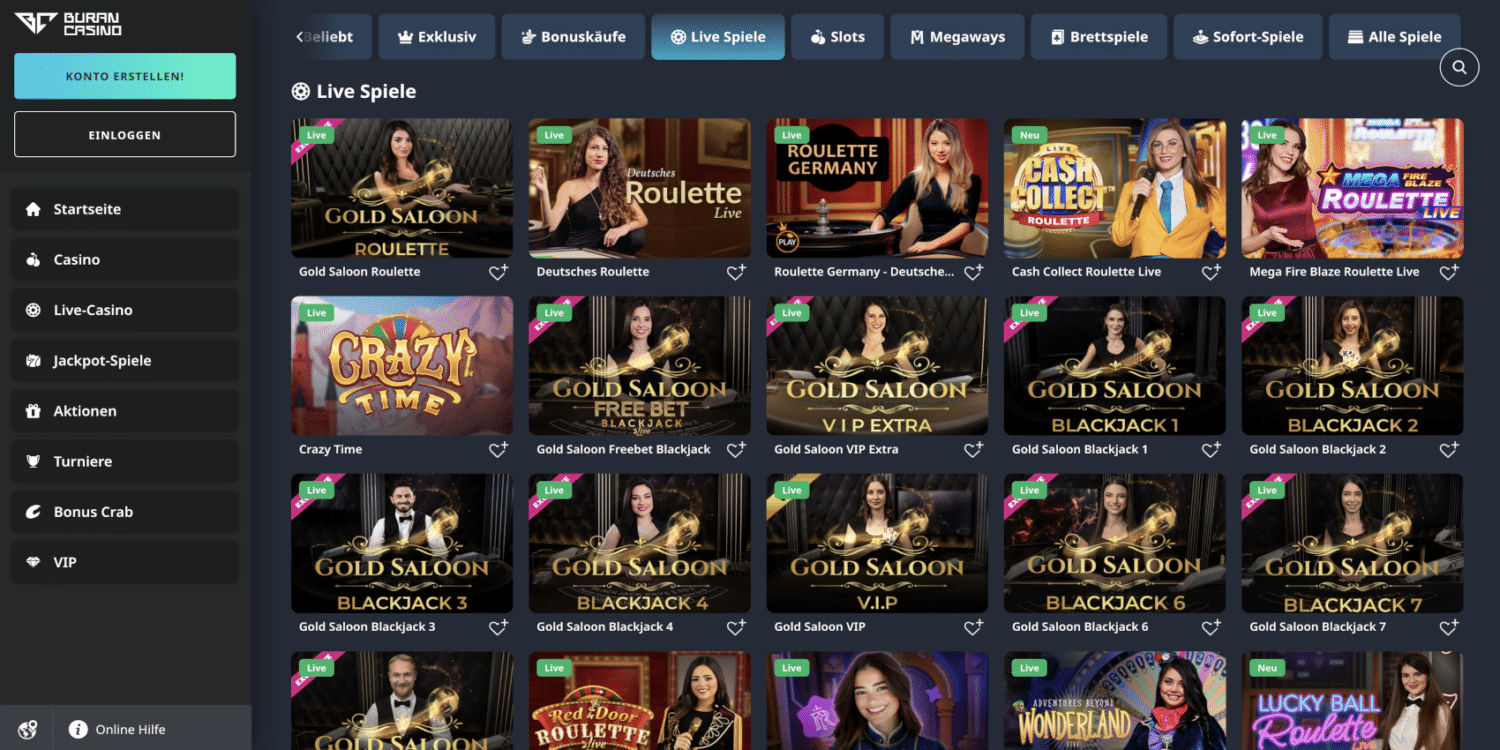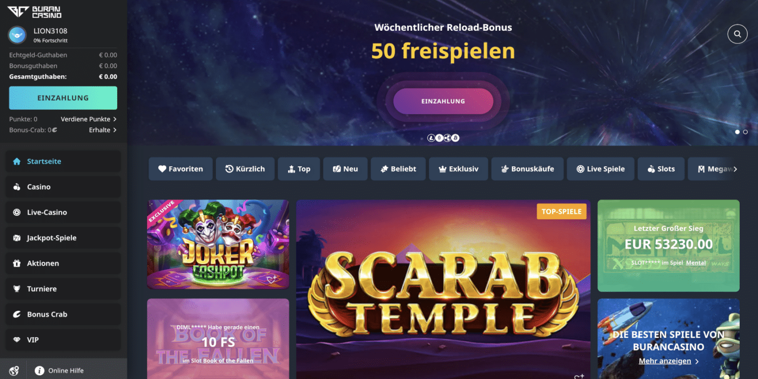 Die Benutzeroberfläche von BuranCasino zeichnet sich durch ihre übersichtliche Gestaltung und intuitive Navigation aus. Das Hauptmenü, strategisch am linken Bildschirmrand platziert, dient als zentraler Navigationspunkt. Von hier aus können Spieler mühelos zwischen den verschiedenen Bereichen des Casinos wechseln: Startseite, Casino, Live-Casino, Jackpot-Spiele, Aktionen, Turniere und den exklusiven VIP-Bereich.