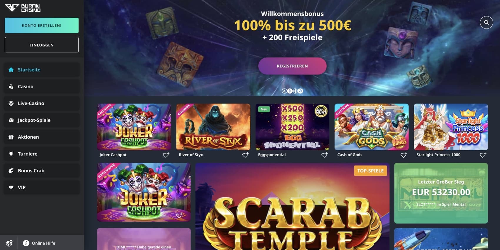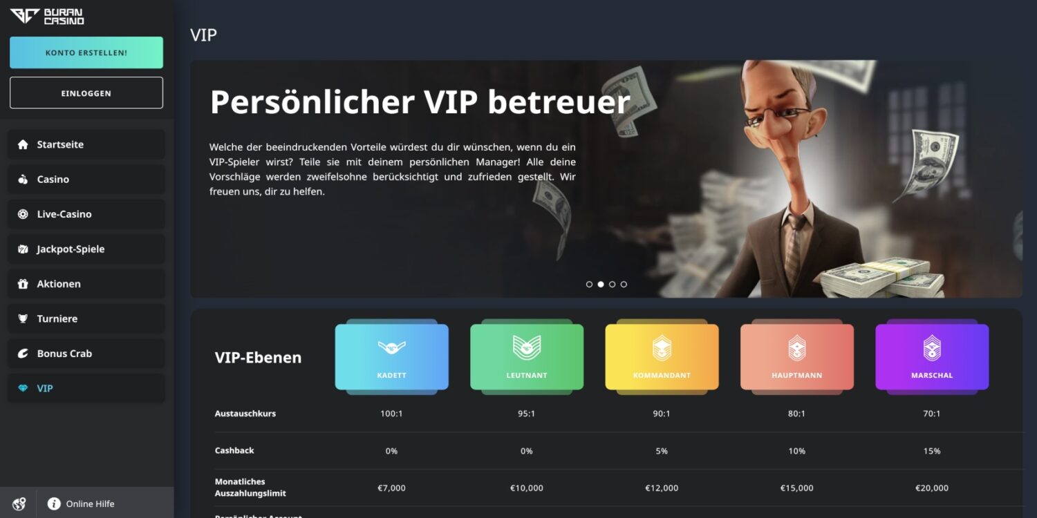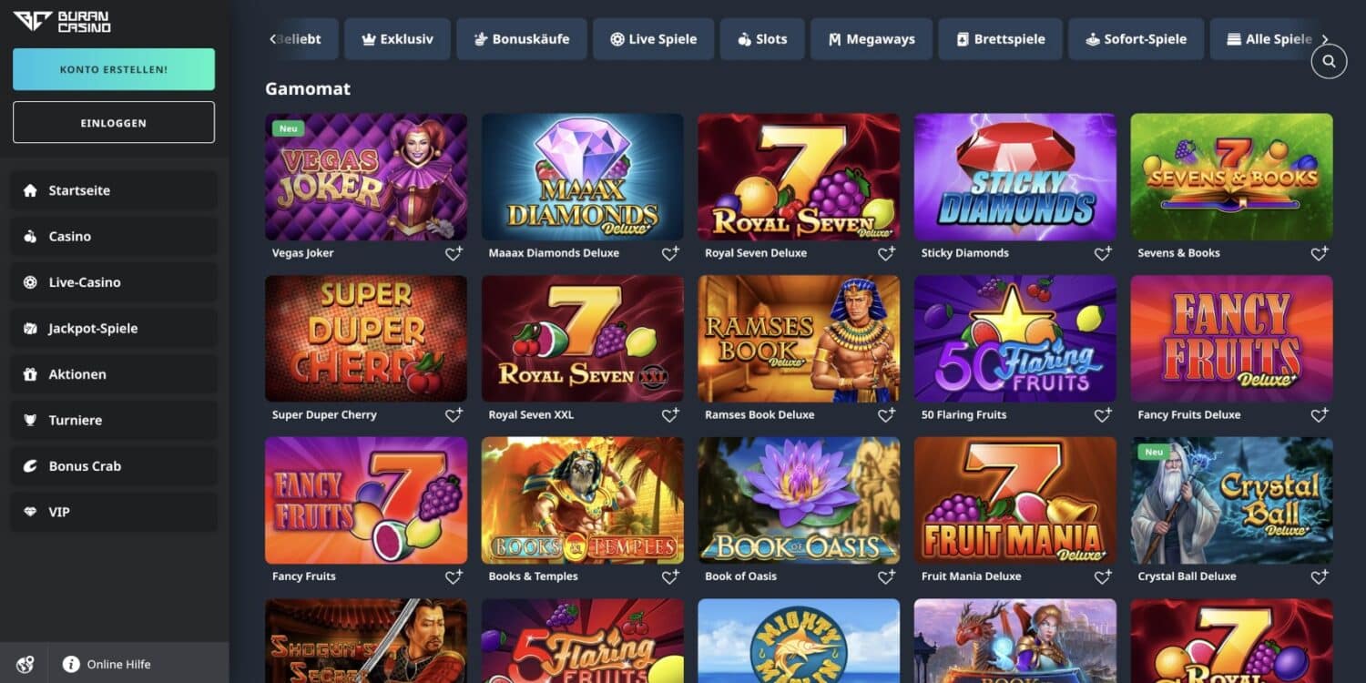 Die Benutzeroberfläche von BuranCasino zeichnet sich durch ihre übersichtliche Gestaltung und intuitive Navigation aus. Das Hauptmenü, strategisch am linken Bildschirmrand platziert, dient als zentraler Navigationspunkt. Von hier aus können Spieler mühelos zwischen den verschiedenen Bereichen des Casinos wechseln: Startseite, Casino, Live-Casino, Jackpot-Spiele, Aktionen, Turniere und den exklusiven VIP-Bereich.
