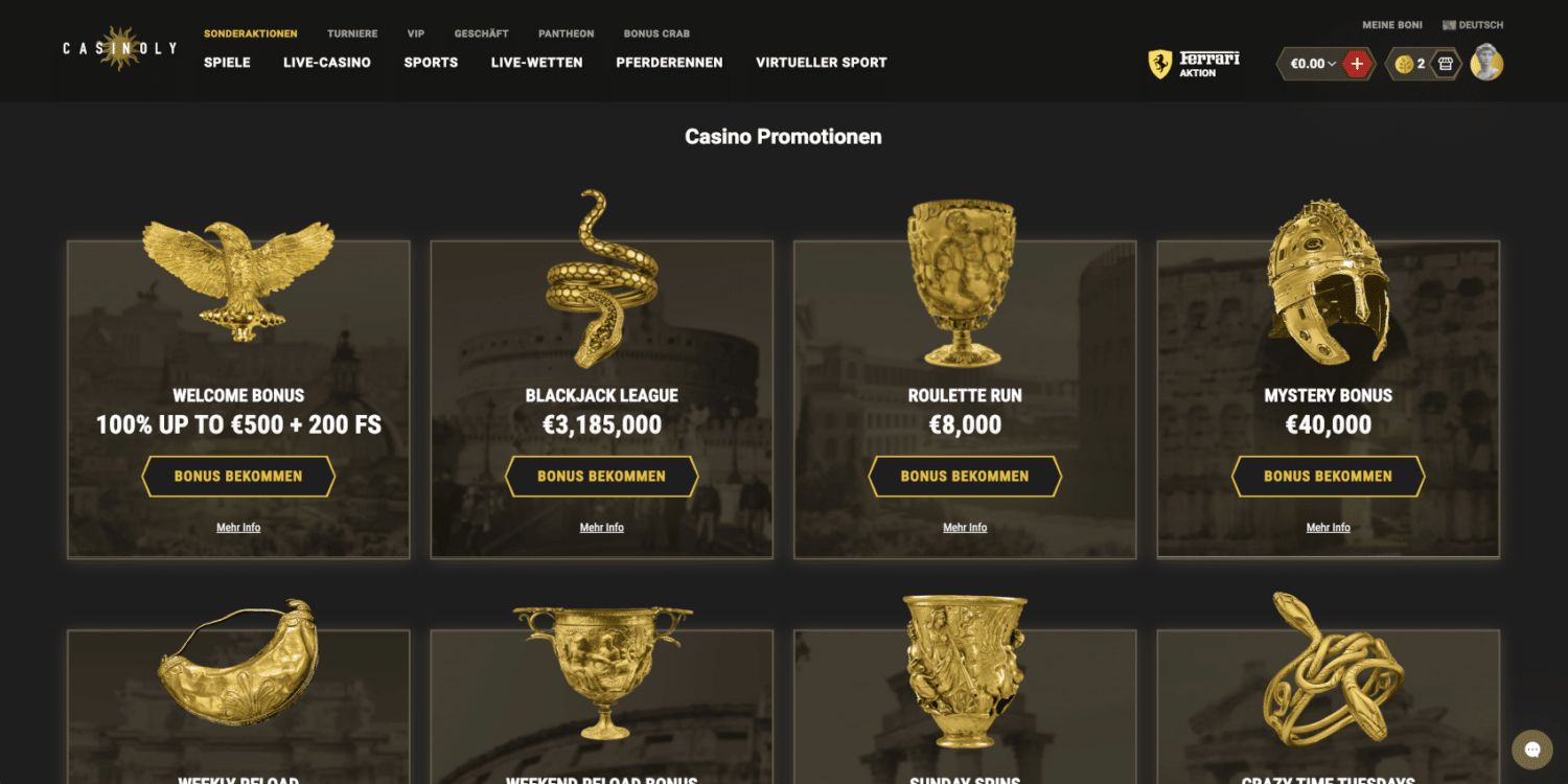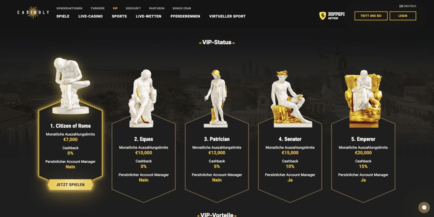 Das VIP-Programm von Casinoly bietet eine faszinierende Struktur, die sich an der Hierarchie des antiken Roms orientiert. Von einfachen „Bürgern von Rom“ bis hin zum mächtigen „Kaiser“ können Spieler durch ihre Aktivität im Casino aufsteigen und dabei immer exklusivere Privilegien genießen. Diese einzigartige Struktur verleiht dem Programm eine besondere Atmosphäre und motiviert Spieler, ihre Position kontinuierlich zu verbessern.