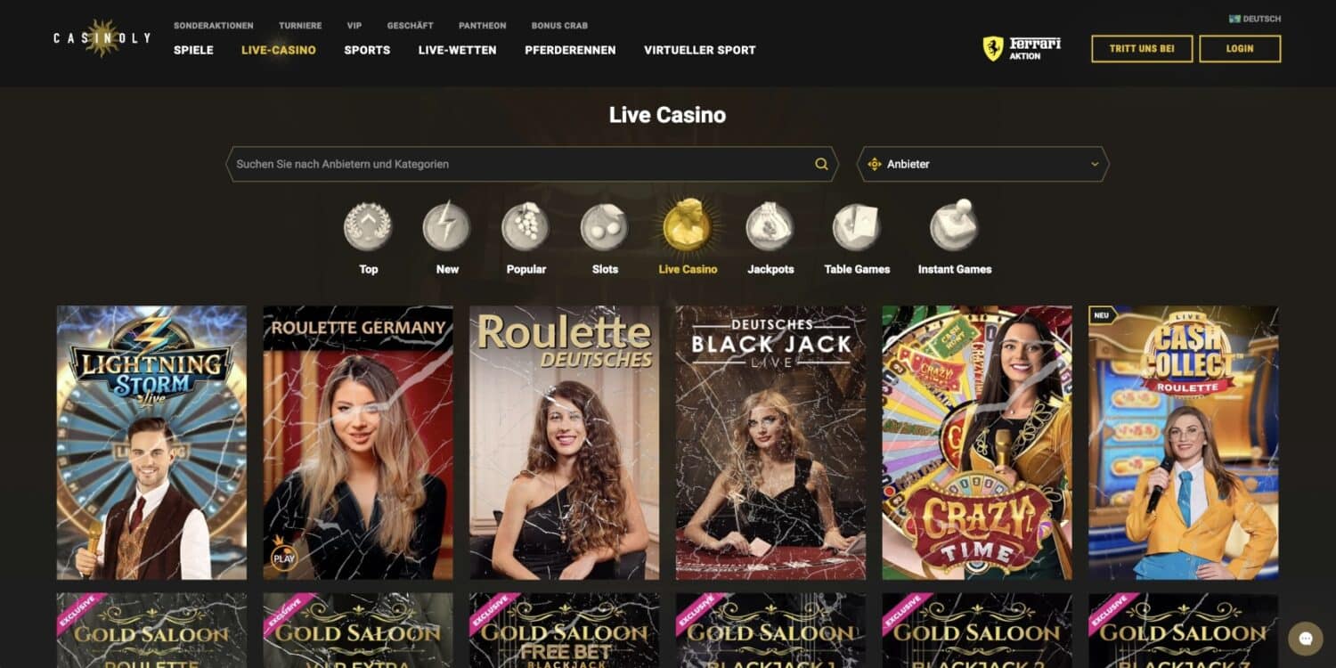 Das Live-Casino von Casinoly bringt die Aufregung eines echten Casinos direkt in dein Wohnzimmer. Mit Software von Branchenführern wie Evolution, Pragmatic Play Live, Playtech und Amusnet erwartet dich hier ein erstklassiges Erlebnis. Rund um die Uhr kannst du gegen echte Dealer antreten und klassische Spiele wie Poker, online Casino Roulette und Blackjack genießen.