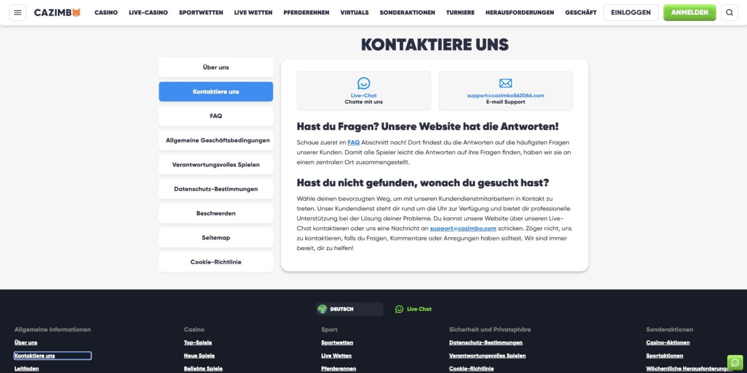 Der Kundenservice von Cazimbo bietet multiple Kontaktkanäle, um den unterschiedlichen Präferenzen der Spieler gerecht zu werden. Im Zentrum steht der Live-Chat, der eine sofortige Verbindung zu einem Kundendienstmitarbeiter ermöglicht. Diese Option ist ideal für dringende Anliegen oder Fragen, die eine schnelle Klärung erfordern.