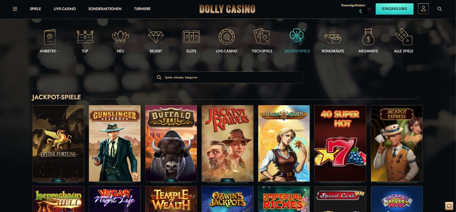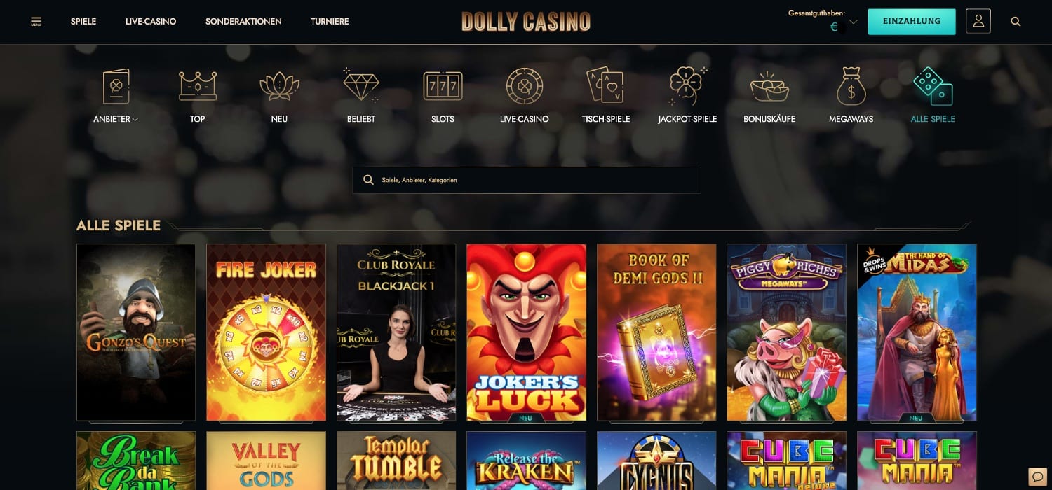 Im oberen Bereich des Dolly Casinos befindet sich die Hauptnavigationsleiste, über die man in die unterschiedlichen Bereiche der Glücksspielplattform gelangt. Einloggen oder sich registrieren, sind von dort aus ebenfalls möglich. Die Startseite des Dolly Casinos, die auch Lobby genannt wird, ist da, um sich einen Überblick zu verschaffen. Im oberen Bereich werden die neusten Bonusangebote angezeigt und darunter die Top-Spiele, neusten Spiele, aktuelle Gewinner, die Gesamtsumme aller verfügbaren Jackpots und vieles mehr.