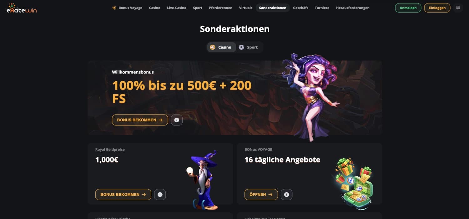 Um den Bonus in Anspruch zu nehmen, musst Du diesen bereits bei der Registrierung auswählen. Sobald Du den Prozess startest, kannst Du zwischen diesem Bonus und einem weiteren Einzahlungsbonus wählen oder mit der Registrierung fortfahren, ohne eines der Angebote anzunehmen. Allerdings verfällt in diesem Fall auch der Anspruch auf den Bonus für Neukunden. Nachdem die Registrierung abgeschlossen ist, ist es wichtig zu wissen, dass Deine erste Einzahlung über die Höhe des Bonus entscheidet. Um den Bonus auszulösen, muss die erste Einzahlung mindestens 20 Euro betragen. Möchtest Du den maximalen Betrag aus dem Bonus erhalten, so bedarf es einer Einzahlung in Höhe von 500 Euro. Anschließend verdoppelt das ExciteWin Casino diesen Betrag und vergibt obendrein noch 200 Freispiele.