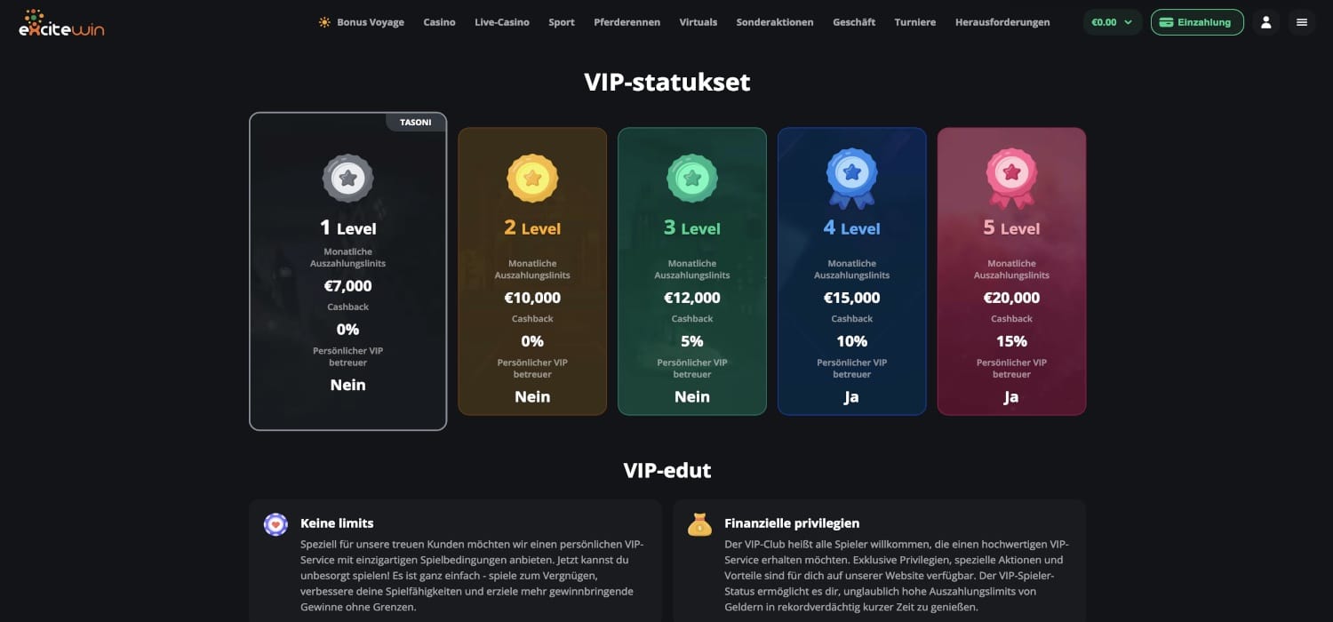 Ein VIP-Modell, wie es andere Casinos bieten, gibt es unseren Erfahrungen zufolge im ExciteWin Casino nicht. Statt eines Stufenmodells setzt das Casino an dieser Stelle auf die sogenannten Herausforderungen. Dabei handelt es sich um wöchentliche Events, bei denen Du Münzen verdienen kannst, indem Du bestimmte Aufgaben bei Slots oder anderen Spielen erfüllst. Gelingt Dir dies, so erhältst Du hierfür Münzen, die Du gegen Boni eintauschen kannst. Als Alternative zum VIP-Modell ist die Idee aus unserer Sicht gar nicht so schlecht, da sich auf diese Weise der wöchentliche Besuch des Casinos lohnen kann.