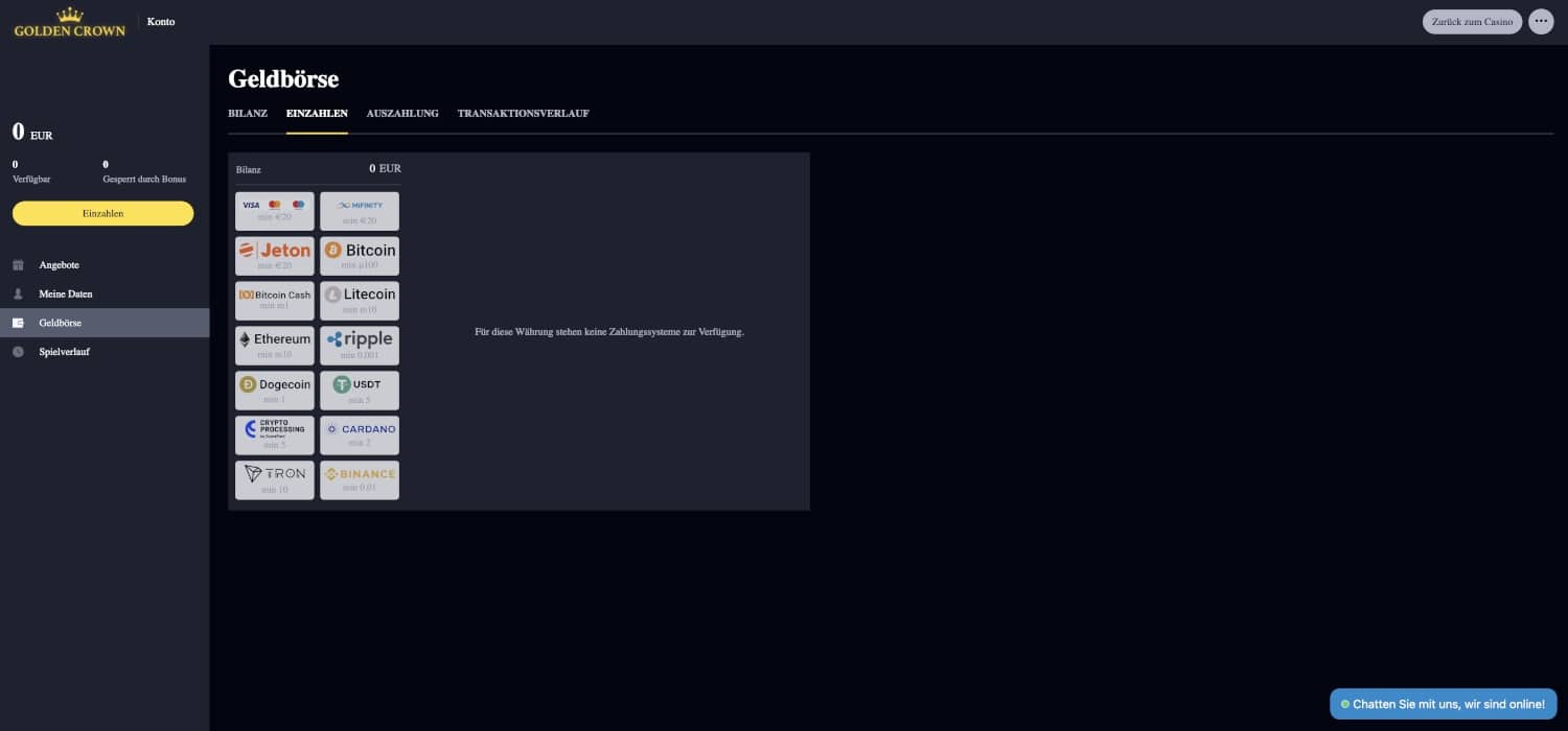 Das Golden Crown Casino bietet einen Mix aus Fiatwährungen und Kryptowährung und kann somit einen breiten Kundenstamm bedienen. Mit VISA, MasterCad, Maestro, MiFinity, Jeton und diversen Kryptowährungen kann schnell und unkompliziert eingezahlt werden. Das eingezahlte Geld ist direkt auf dem Spielerkonto verfügbar. Gefehlt haben allerdings bekannte E-Wallets wie Neteller oder Skrill.