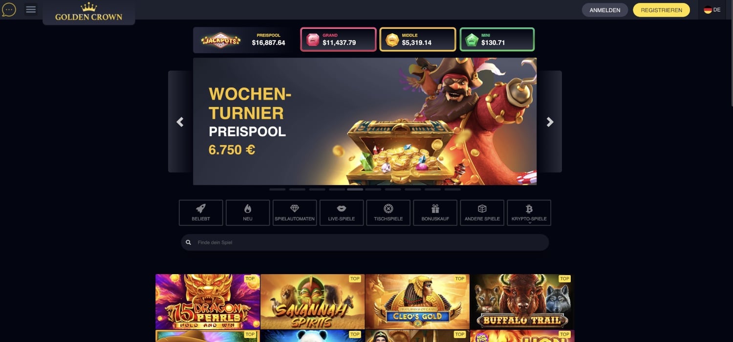 Im Golden Crown Casino erwartet Sie eine Welt voller Spannung und Unterhaltung. Mit über 6.000 erstklassigen Spielen und großzügigen Golden Crown Casino Bonusangeboten ist das Casino eine Top-Destination für Online-Glücksspiele. Der Willkommensbonus beträgt bis zu 6.000 Euro, damit Spieler direkt voll durchstarten können. Zusätzlich gibt es 100 Casino Freispiele für Spielautomaten. Im Golden Crown Casino finden Sie Spiele von renommierten Entwicklern wie NetEnt, Microgaming und Playtech. Von Spielautomaten über Tischspiele bis hin zu Live-Dealer-Partien – hier ist für jeden Geschmack etwas dabei. Die Plattform ist benutzerfreundlich gestaltet und lädt zum Verweilen ein. Treten Sie ein in die glänzende Welt des Golden Crown Casinos und erleben Sie Nervenkitzel und die Möglichkeit, große Gewinne zu erzielen. Unser folgender aufwändig recherchierter Golden Crown Test beleuchtet das Casino von allen wichtigen Seiten. Hier erfahren Sie, was sie in Sachen Spiele, Bonusaktionen, Zahlungen oder Support auf Sie wartet und ob Golden Crown ein seriöses online Casino ist.