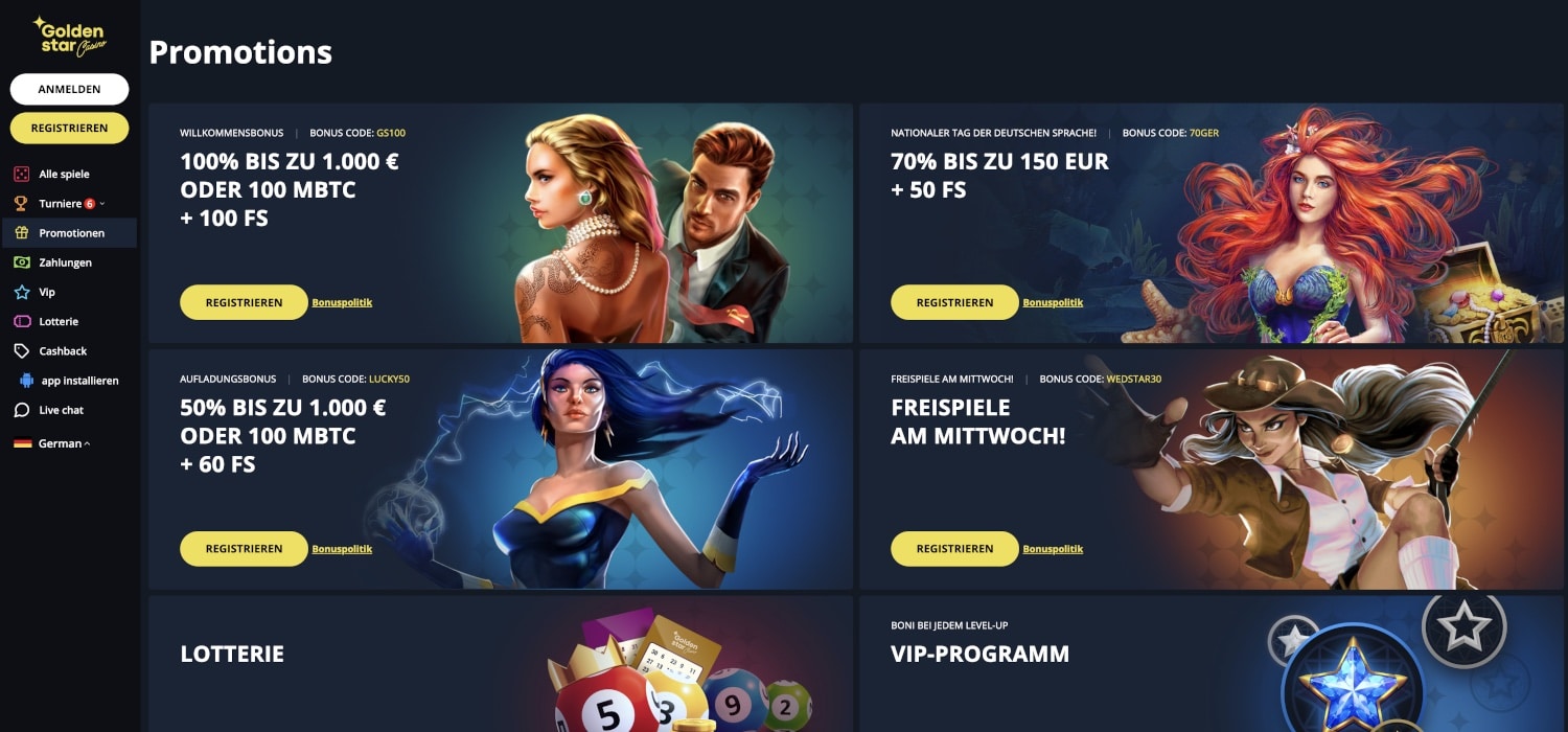 Im Golden Star Casino können die Spieler mit dem fairen Willkommensangebot einen sehr guten Start hinlegen. Nach dem Golden Star Casino Login können sich Neukunden einen Golden Star Casino Willkommensbonus in Höhe von 100% von bis zu 1.000 Euro abholen. Alternativ winkt ein Neukundenbonus von 100 MTBC sowie 100 Freispielen bei Nutzung von Kryptowährungen.