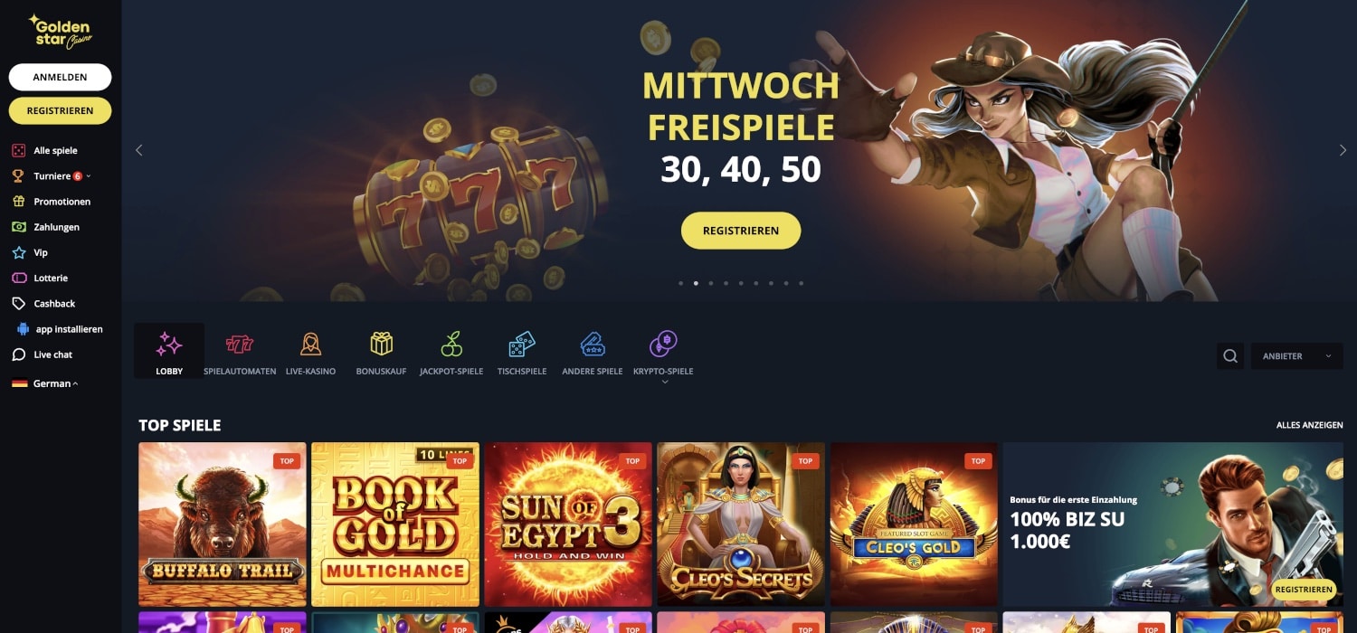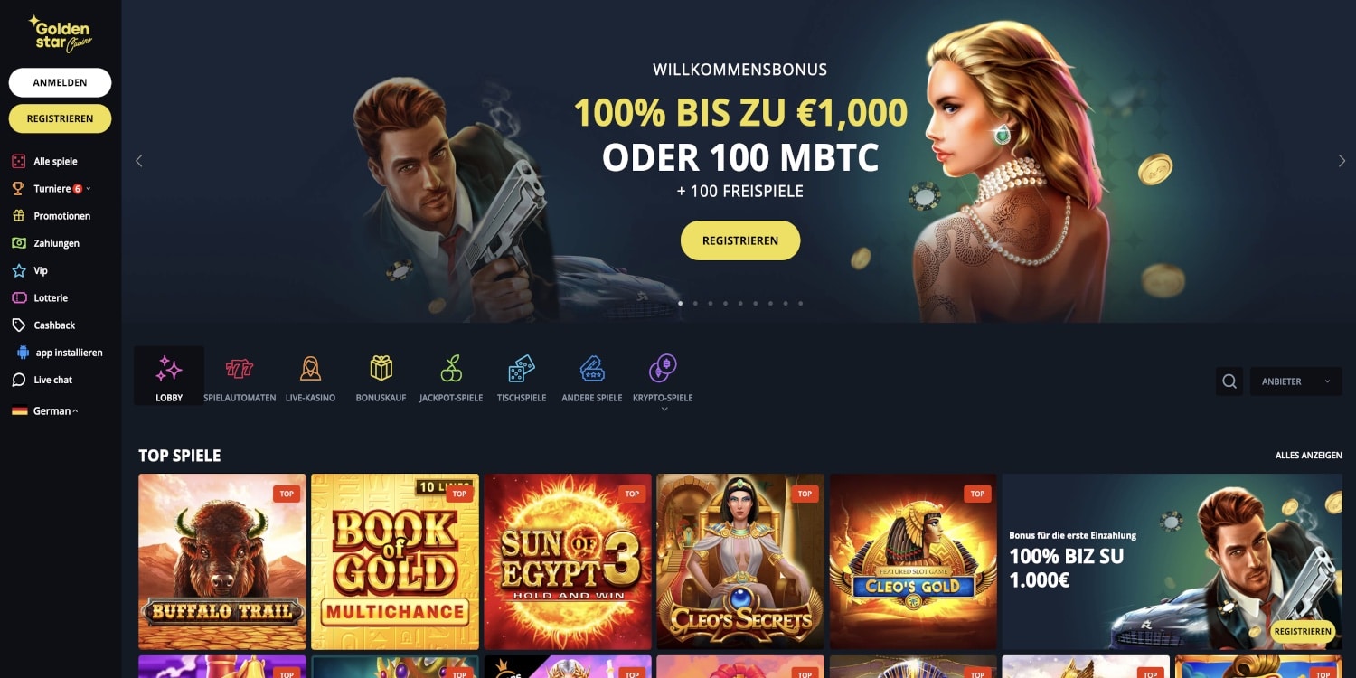 Das Golden Star Casino ist bereits seit über zehn Jahren am Markt. Dank der zahlreichen Boni ist das auch mit einem Zusatzguthaben möglich. Die benutzerfreundliche Web App lädt auch zu einem mobilen Spielerlebnis ein. Wer seine Einsätze besser im Blick behalten möchte, der nutzt einfach die einstellbaren Limits. Ganz gleich, ob Live Poker, Roulette oder Megaways-Slots – das Golden Star Casino bietet für jeden Geschmack das passende Game. Die Zahlungen werden schnell abgewickelt und der Kundendienst steht schriftlich sowie persönlich zur Verfügung. Unsere Golden Star Casino Erfahrungen fallen damit insgesamt sehr gut aus. Natürlich können Sie an dieser Stelle auch mit einem attraktiven Golden Star Neukundenbonus oder mit einem Krypto-Bonus einsteigen.