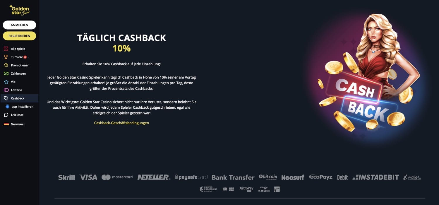 Wenn Sie fleißig einzahlen, können Sie sich jeden Tag Ihren 10% Cashback abholen. Somit erhalten Sie regelmäßige Rückzahlungen. Daher lohnt es sich, bei den Golden Star Casino seine Einsätze zu platzieren und hier langfristig aktiv zu sein.