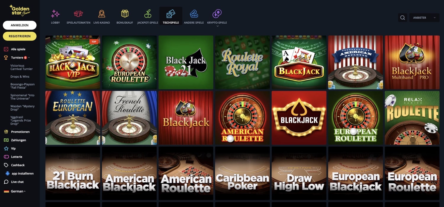 Abseits der Walzen sorgen die Tischspiele für Unterhaltung. Der Fokus liegt auf den Klassikern Poker, online Casino Roulette sowie online Casino Blackjack. Hier sind die Spiele Blackjack VIP, European Roulette, Blackjack 21, Roulette Royal, Blackjack Multihand Pro, Caribbean Poker sowie European Blackjack einen Blick wert. Durch die verschiedenen Varianten wird jede Menge Abwechslung geboten. Alle Tischspiele können auch mobil aufgerufen werden. Zudem kann im Vorfeld eine Demo-Version genutzt werden. Somit können sich die Spieler mit den Spielregeln vertraut machen. Die Auswahl an Tisch-und Kartenspielen kann sich im Golden Star Casino auf jeden Fall sehen lassen.