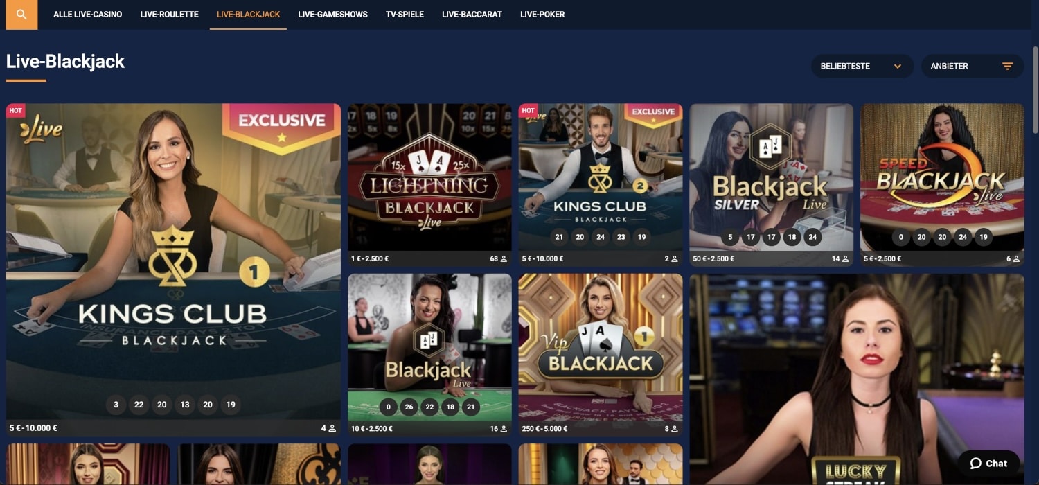Außerdem können Sie Ihr Glück natürlich beim Live Blackjack versuchen. Auch hier warten verschiedene Varianten auf Sie, darunter Speed Blackjack, Lightning Blackjack, Power Blackjack, Blackjack Party und Lucky Strike Blackjack. An den privaten Tischen sind die höchsten Einsätze möglich, aber es sind auch Tische mit einem geringen minimalen Limit für Einsätze vorhanden.