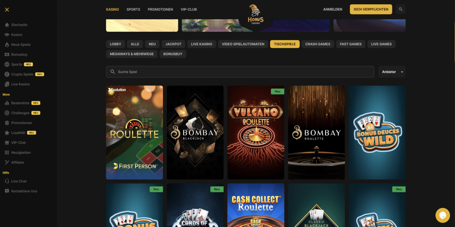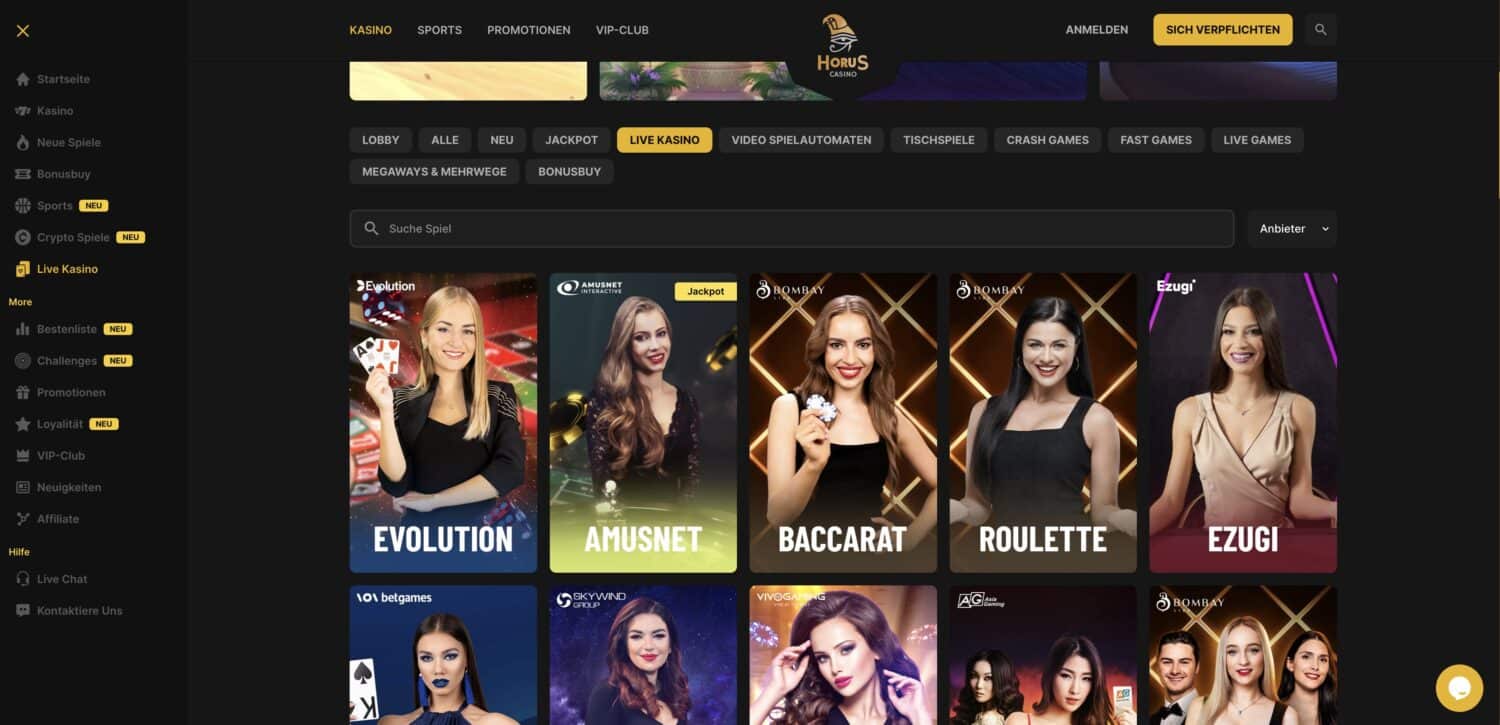 Das Horus Casino bringt die Aufregung und Atmosphäre eines echten Casinos direkt in dein Wohnzimmer. Mit seiner beeindruckenden Live Casino-Lobby bietet es ein immersives Spielerlebnis, das selbst erfahrene Casinospieler begeistern wird.