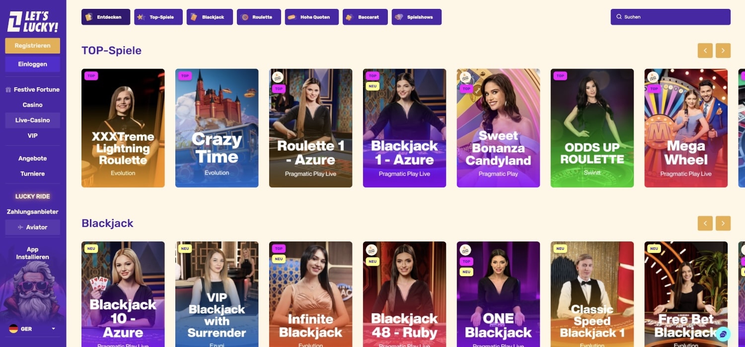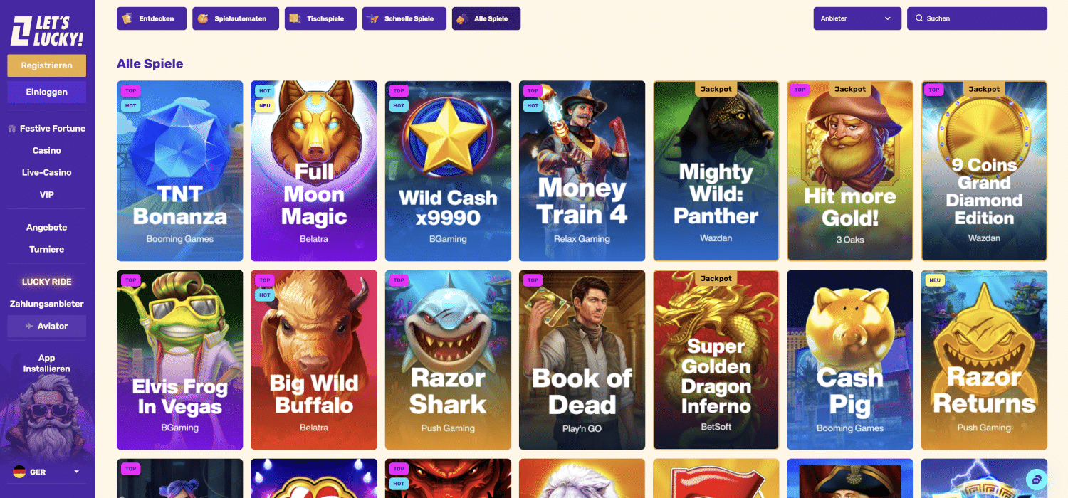 Ein großer Vorteil für die Spielerinnen und Spieler im Let’s Lucky Casino ist die große Vielfalt der Spiele. Sie erwartet eine riesige Spieleauswahl, die Ihnen ständige Abwechslung garantiert. Auf der Startseite sind die Games in übersichtliche Kategorien unterteilt: