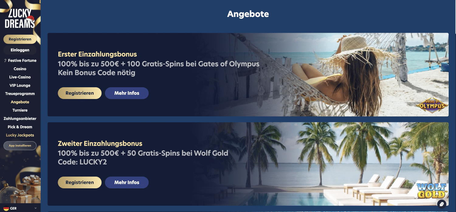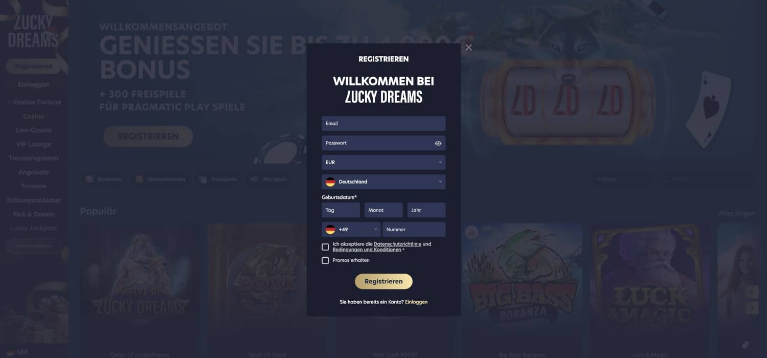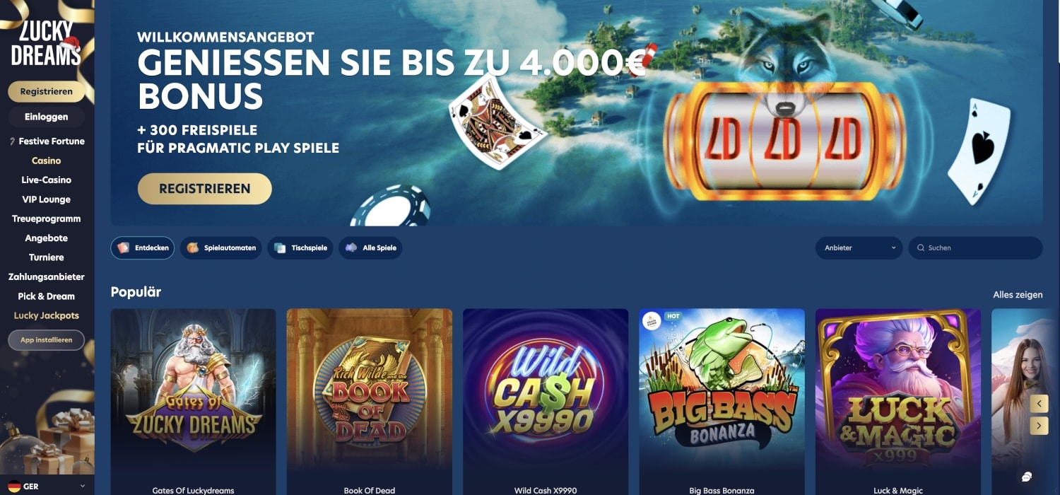 Viele Online-Casinos werben mit attraktiven Boni, vor allem die Anreize für Neukunden werden gern prominent beworben. Zurzeit wirbt das Lucky Dreams Casino mit dem „WILLKOMMEN IM LUCKY DREAMS CASINO“-Bonus. Bei dieser Aktion können Sie zusätzlich bis zu 4.000 Euro und 300 Freispiele für Pragmatic Play Spiele gewinnen. Der Bonus ist also ausgesprochen interessant, weil die potentiell erreichbare Belohnung außerordentlich lukrativ wirkt. Das Angebot steht außerdem nur Neukunden zur Verfügung. Doch das sollte niemanden enttäuschen, der in diesem Online-Casino mehr Zeit verbringen möchte: Stammkunden können nämlich auf viele weitere Boni zugreifen.