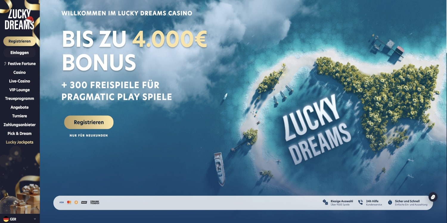 Das Lucky Dreams Casino ist ein Online Casino, in dem Sie mit Casino Echtgeld spielen können. Auf den ersten Blick erinnert die Website an einen Urlaub im karibischen Meer. Immerhin gibt es auf der Startseite ein reizvolles Inselatoll mit weißen Sandstränden und türkisblauem Wasser zu sehen, umringt von einigen Yachten. Doch was hat das Lucky Dreams Casino wirklich zu bieten, zum Beispiel im Hinblick auf ein Bonus-Angebot? Wir haben uns das Lucky Dreams Casino genauer angesehen und fassen hier unsere Erfahrungen und Eindrücke komprimiert zusammen.