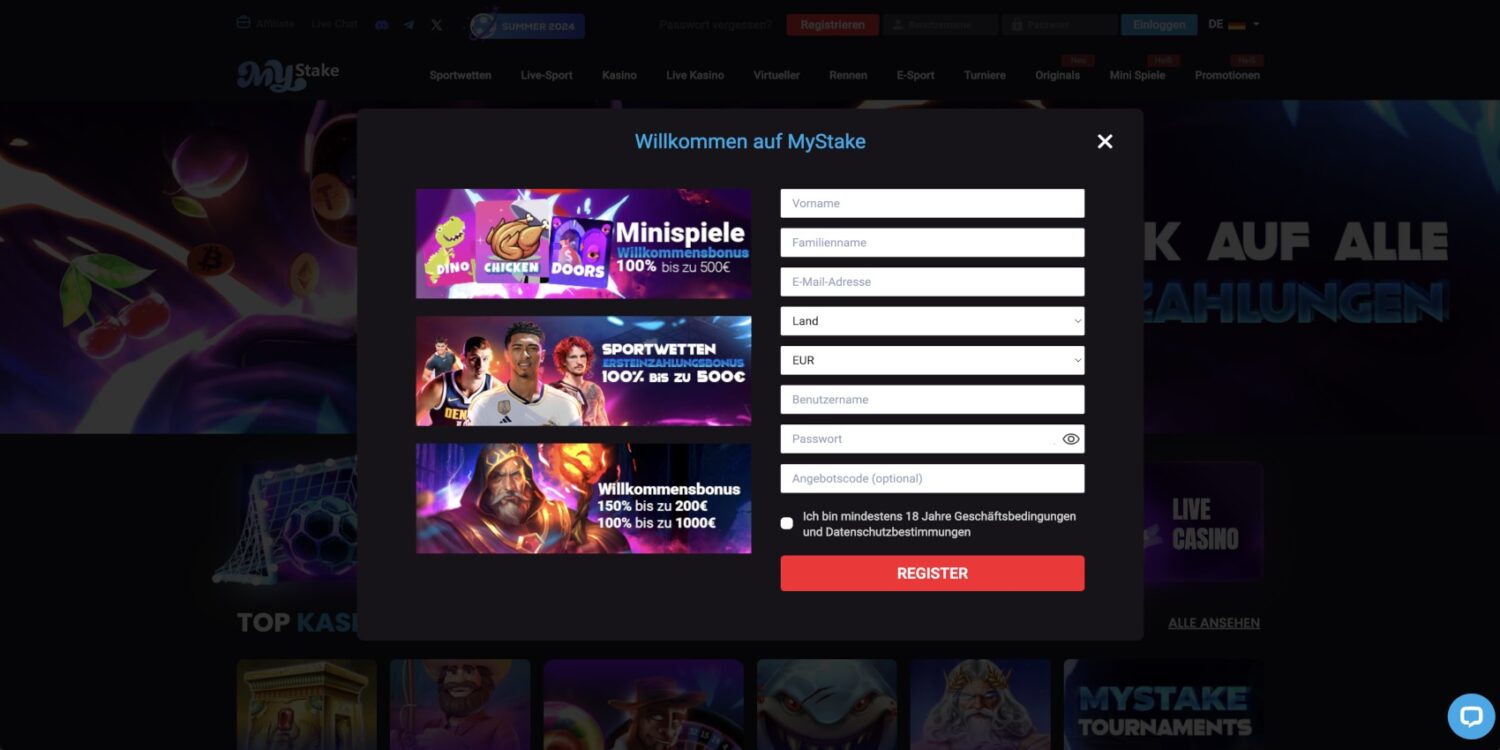 Der Einstieg bei MyStake beginnt mit einem unkomplizierten Registrierungsprozess. Neue Nutzer werden von einer übersichtlichen Anmeldemaske begrüßt, die nur die wesentlichen Informationen abfragt. Ein Klick auf den „Registrieren“-Button öffnet das Anmeldefenster, wo man schrittweise durch die Eingabe persönlicher Daten geführt wird. Besonders praktisch: Zusätzliche Details wie Adresse oder Postleitzahl werden erst vor der ersten Einzahlung benötigt, was den initialen Prozess beschleunigt.