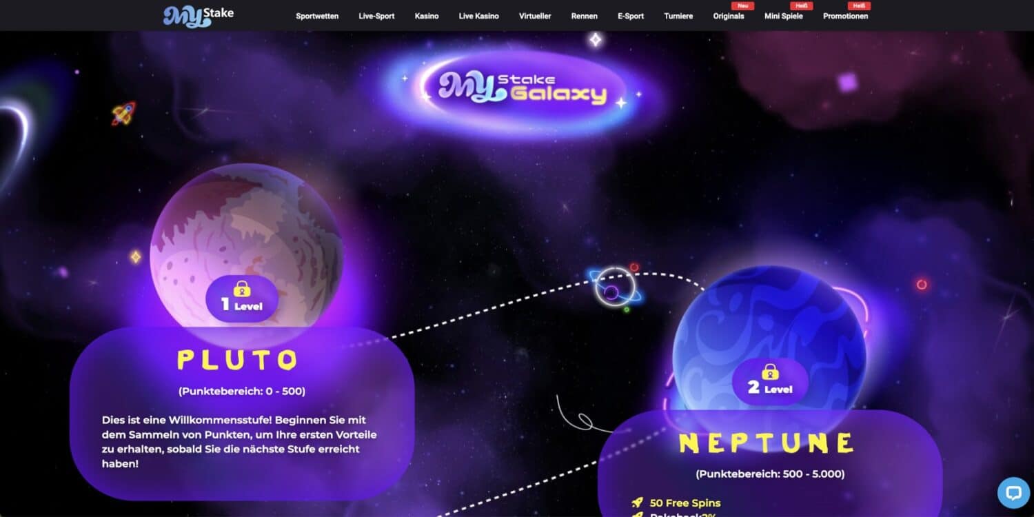 Das MyStake Galaxy VIP-Programm bietet Spielern somit ein umfangreiches Belohnungssystem, das treue Kunden mit attraktiven Boni und exklusiven Vorteilen belohnt. Die galaktische Thematik verleiht dem Programm einen zusätzlichen Reiz und motiviert Spieler, in immer höhere VIP-Sphären vorzudringen.