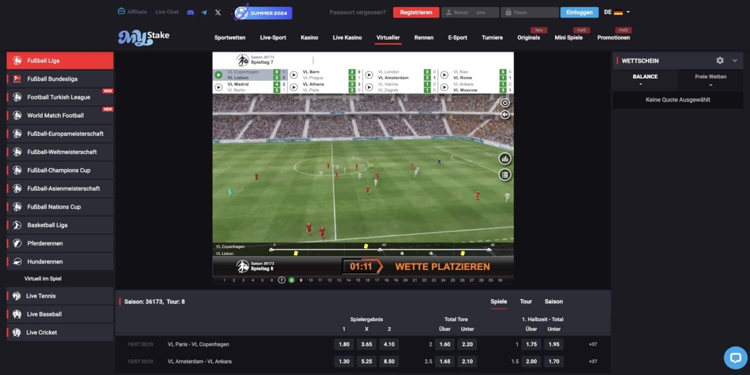 Ein herausragendes Merkmal von MyStake ist das Angebot an virtuellem Sport, das eine faszinierende Brücke zwischen traditionellen Sportwetten und Casinospielen schlägt. Dieses Feature ermöglicht es Spielern, rund um die Uhr auf computergenerierte Sportevents zu wetten, unabhängig von realen Spielplänen oder Wetterbedingungen.