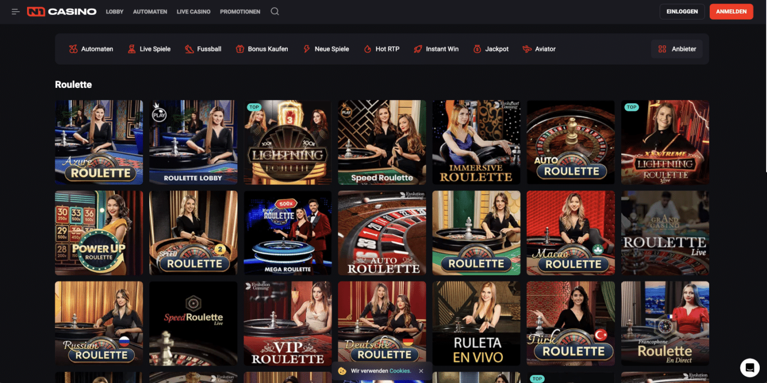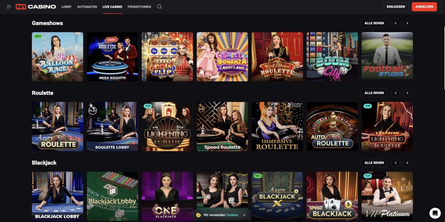 Das Live Casino des N1 Casino bringt die Aufregung eines echten Casinos direkt auf Ihren Bildschirm. Betrieben wird es von renommierten Softwareanbietern wie Evolution Gaming, Pragmatic Play Live, Authentic Gaming, Playtech, Play’n Go und SWINTT.