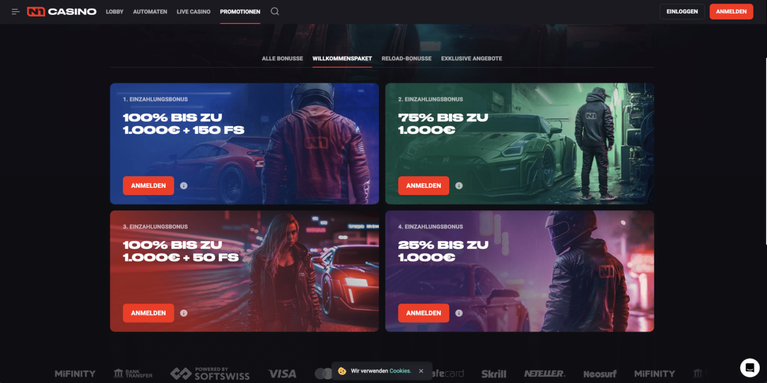 Das N1 Casino lockt Neukunden mit einem beeindruckenden Willkommenspaket von bis zu 4.000€ und 200 Freispielen, das sich über die ersten vier Einzahlungen erstreckt. Dieses großzügige Angebot bietet Spielern einen starken Anreiz, ihre Casino-Reise bei N1 zu beginnen.