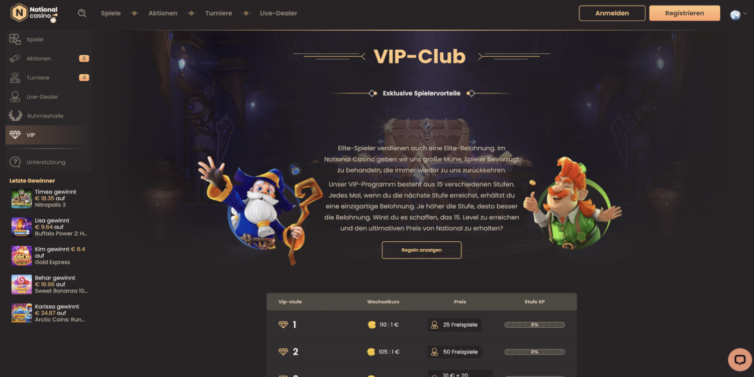 Das VIP-Programm des National Casinos belohnt treue Spieler mit exklusiven Vorteilen. Es umfasst 15 VIP-Stufen, wobei jede Stufe großzügigere Belohnungen bietet.
