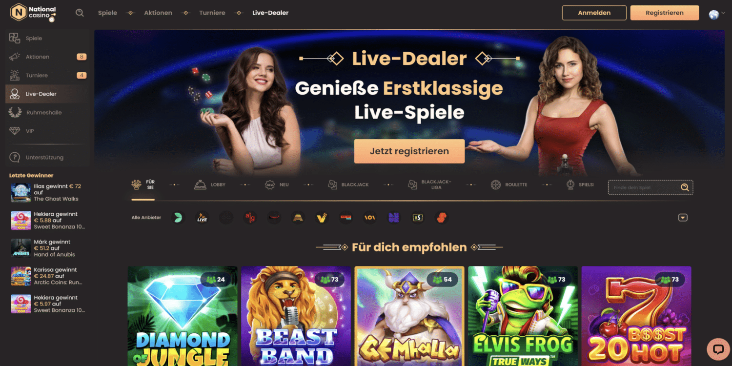 Das Live-Casino des National Casinos ist rund um die Uhr geöffnet und bietet dir authentisches Casinofeeling. Hier spielst du mit echten Dealern Klassiker wie Poker, Roulette und Blackjack, aber auch exotischere Spiele wie Sic Bo oder Andar Bahar. Besonders spannend sind die Game Shows wie „Crazy Time“ oder „Boom City“, die für zusätzliche Unterhaltung sorgen.