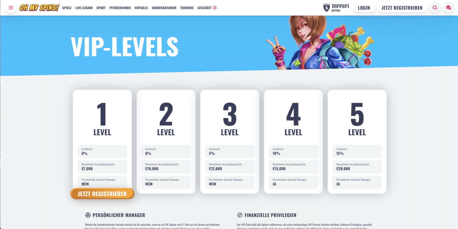 OhMySpins bietet seinen treuesten Spielern ein exklusives VIP-Programm, das das Spielerlebnis auf ein neues Level hebt. Mit fünf Stufen belohnt dieses Programm engagierte Spieler mit zunehmend attraktiven Vorteilen. Von erhöhten Auszahlungslimits über Cashback-Angebote bis hin zu persönlicher Betreuung – das VIP-Programm von OhMySpins lässt keine Wünsche offen.