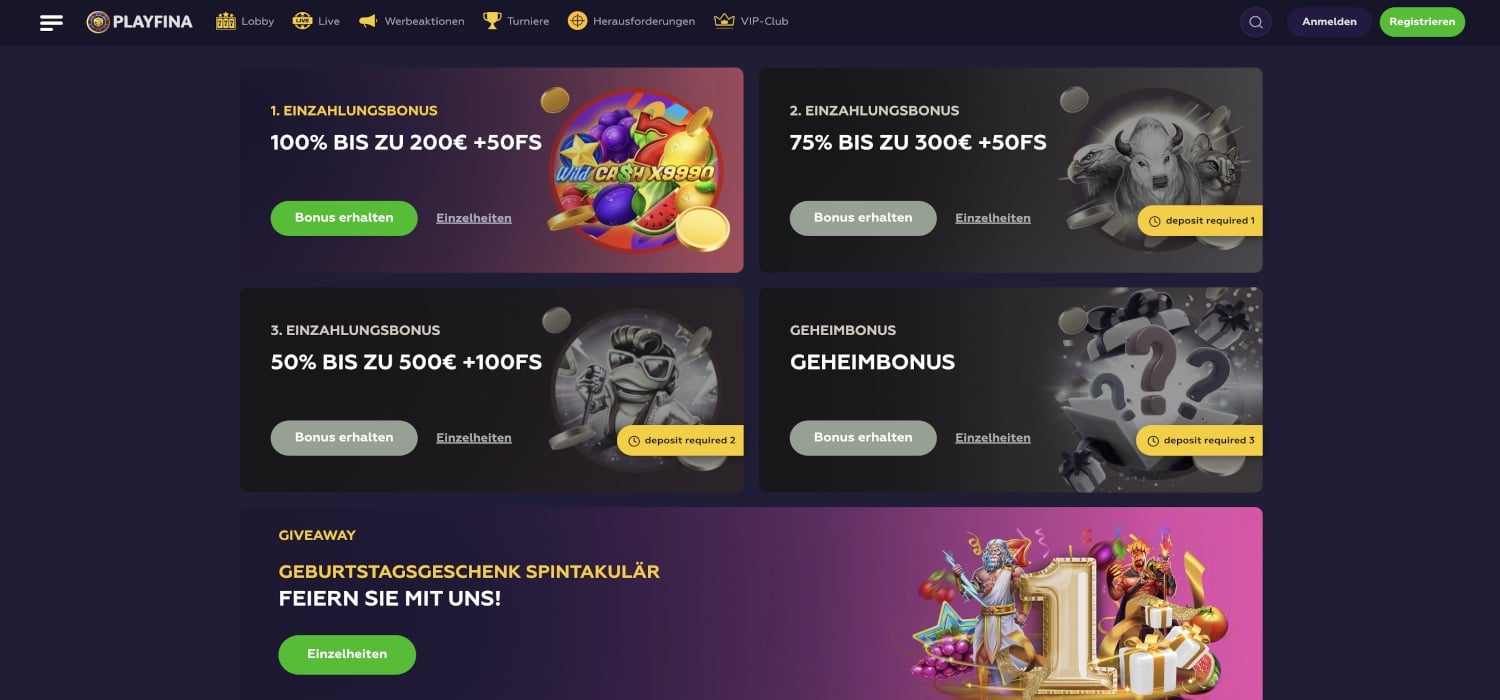 In der Regel ist der Bonus für neue Kunden das Aushängeschild eines jeden Casinos. Mit seiner Hilfe sollen neue Gäste an das Angebot herangeführt werden. Da es sich bei dem Betreiber des Playfina Casinos um ein renommiertes Unternehmen mit zahlreichen Erfahrungen im Betrieb von Casinos handelt, ist das Volumen des Bonus nicht unbedingt erstaunlich. Dennoch sind bis zu 1.000 Euro und 200 Freispiele freilich ein Grund, das Casino zu besuchen. Was im ersten Moment nach einem riesigen Bonus klingt, entpuppt sich nach einigen Klicks jedoch als ein gestückelter Bonus, der nicht mit einer einzigen Einzahlung aktiviert werden kann. Stattdessen besteht der Bonus für neue Spieler im Playfina Casino aus drei Teilen sowie eines weiteren, geheimen Bonus.