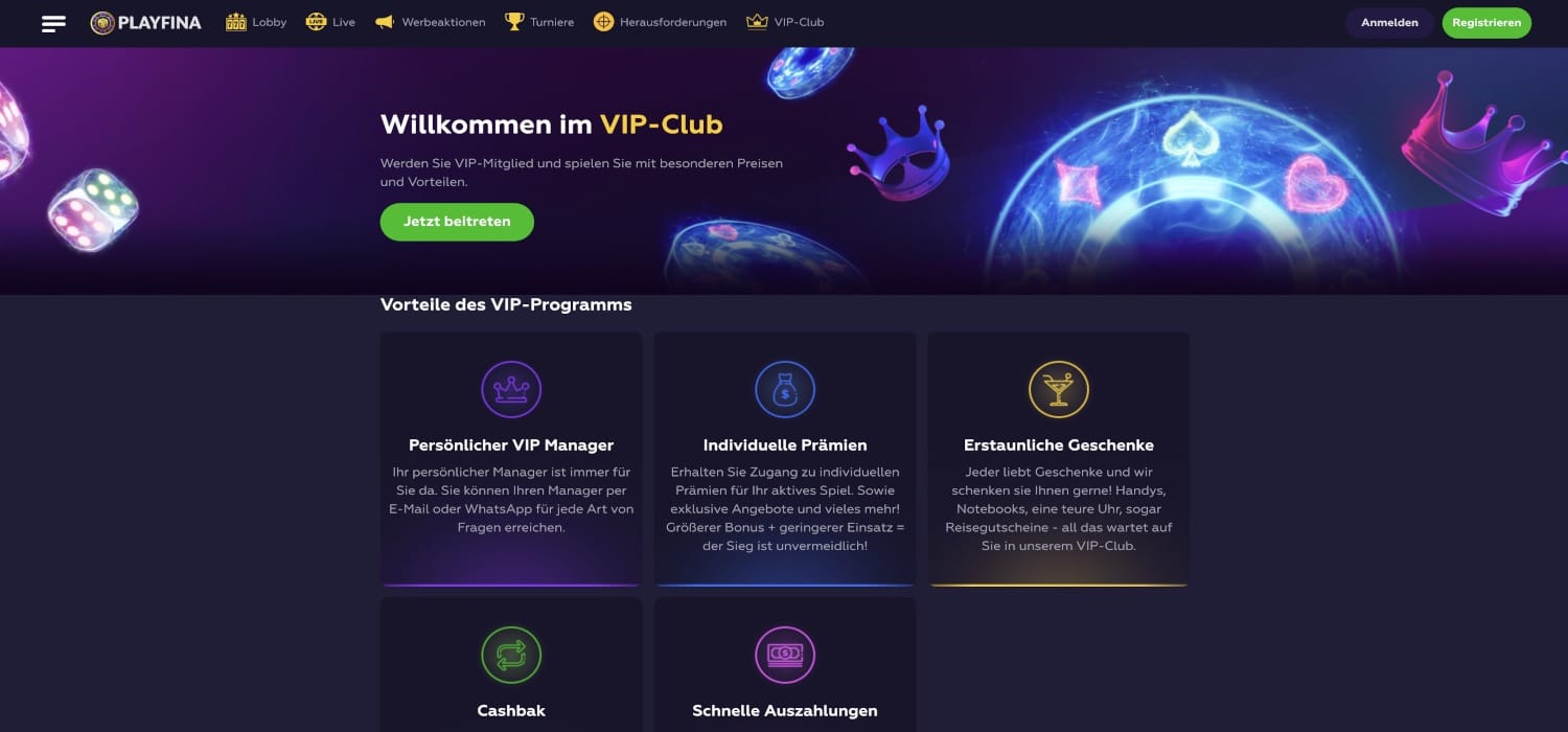 Abgerundet wird das weitere Bonusangebot im Playfina Casino durch ein VIP-Modell, wie es auch einige andere Casinos pflegen. Per Einzahlungen und Einsätze erspielst Du Dir Punkte, mit deren Hilfe Du im System aufsteigen kannst. Auf Dauer kannst Du dadurch von individuellen Prämien, Cashbacks und bevorzugten Auszahlungen profitieren. Zudem erhältst Du Zugang zu einem persönlichen VIP Manager, den Du bei Bedarfs sogar via WhatsApp kontaktieren kannst.