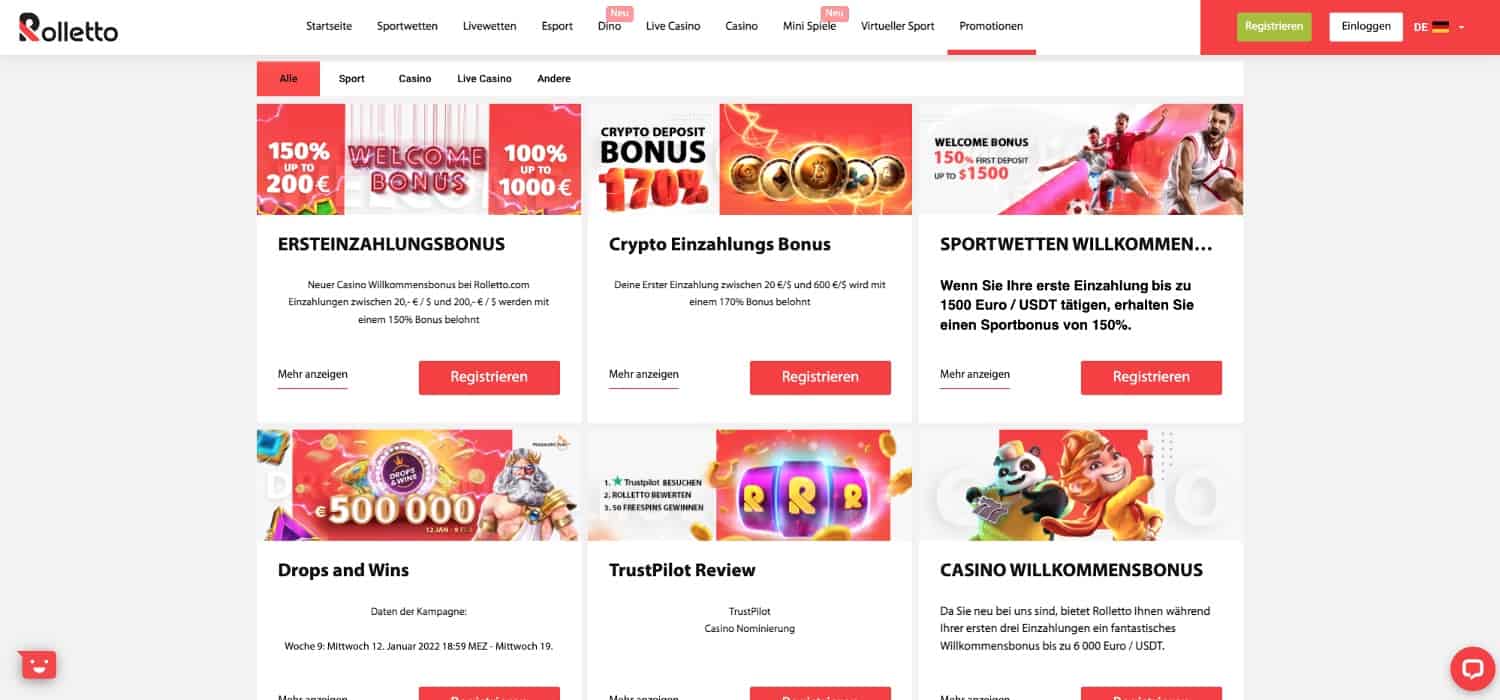 Unsere Rolletto Casino Erfahrungen mit den Livespielen waren hervorragend und auch sonst braucht sich das Angebot an Casinospielen nicht zu verstecken. Neben vielen Slots warten noch Jackpots, Minispiele und Tisch- und Kartenspiele. Der Kundendienst ist per Live-Chat 24/7 erreichbar.