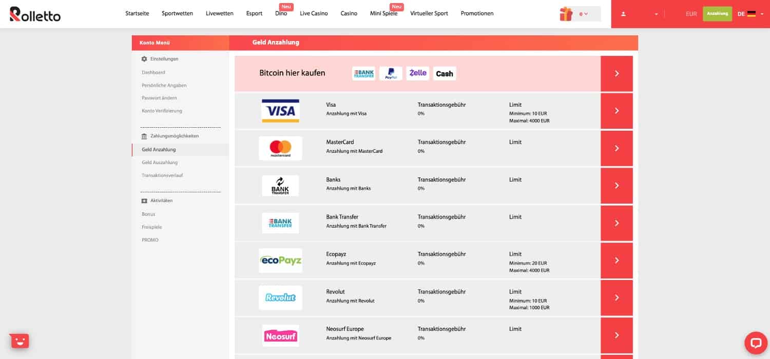 Die Mindesteinzahlung beträgt bei allen Einzahlungsmethoden laut den Rolletto Geschäftsbedingungen 20 Euro. Die maximale Geldsumme, die eingezahlt werden kann, hängt von dem gewählten Zahlungsmittel ab und beträgt beispielsweise mit Überweisung 900 Euro und mit ecoPayz 4000 Euro.
