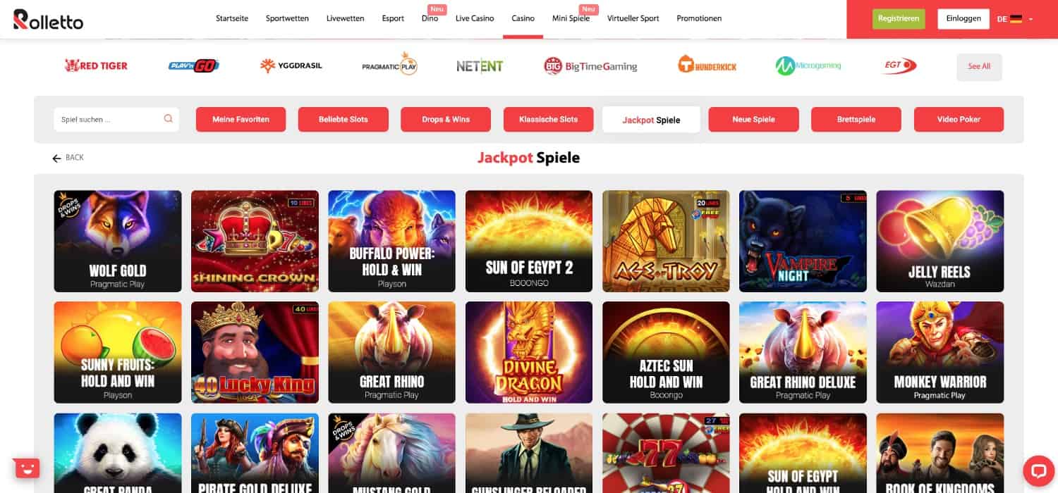 Zu unserem Rolletto Casino Test gehört auch das Abklopfen des Spielangebotes und mit diesem haben wir tolle Erfahrungen gemacht. Es gibt jede Menge Casinospiele von namhaften Anbietern wie NetEnt, Yggdrasil, Big Time Gaming, Thunderkick und vielen mehr. Für jeden Geschmack ist auch das richtige dabei und es lassen sich Slots, Jackpots und viele Tisch- und Kartenspiele spielen.