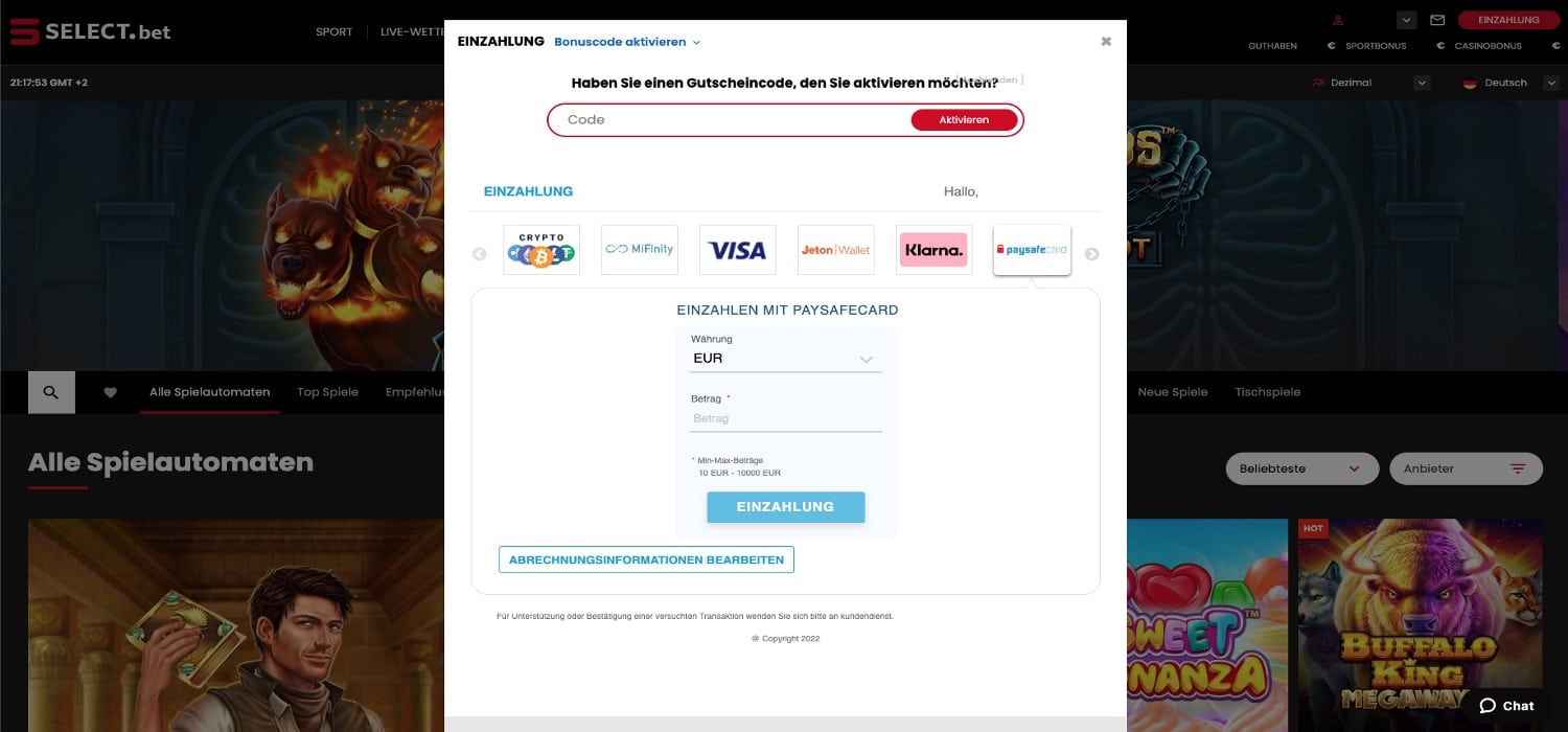 - Melden Sie sich bei dem Select.Bet Casino an und zahlen Sie mindestens 20 Euro ein