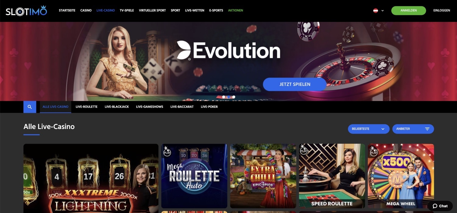 Das Live Casino von Slotimo bringt dir die Atmosphäre eines echten Casinos direkt nach Hause. Hier findest du nicht nur die klassischen Tischspiele mit echten Dealern, sondern auch innovative Live Gameshows. Freue dich auf Spiele wie Monopoly, Dreamcatcher, Deal or No Deal, Mega Wheel und ein spannendes Football Studio.