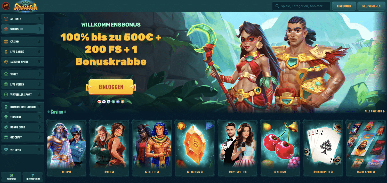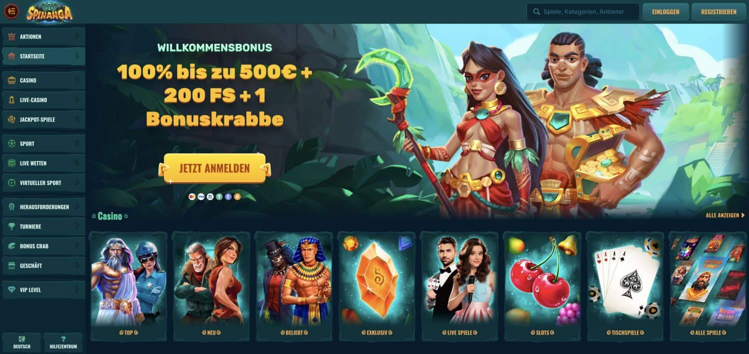 Spinanga ist ein vielversprechendes Online Casino mit weit über 7.000 spannenden Games. Die User dürfen sich hier unter anderem auf Slots, Spielshows, Poker, Roulette, Blackjack und etliche Jackpot-Games freuen. Gut angekommen ist in unserem aktuellen Spinanga Casino Test auch der hauseigene Bonus-Shop, wo gesammelte Treuepunkte gegen lukrative Prämien eingelöst werden können. Neue Spieler profitieren derweil von einem attraktiven 100% Ersteinzahlungsbonus in Höhe von bis zu 500 Euro sowie von 200 Freispielen. Darüber hinaus werden Bestandsspieler mit zahlreichen Bonusaktionen dauerhaft bei Laune gehalten. Um Zahlungen schnell und sicher abwickeln zu können, stehen sogar Kryptowährungen wie Bitcoin oder Litecoin zur Verfügung. Unterm Strich spricht aus unserer Sicht nichts dagegen, sich kostenlos und unverbindlich im Spinanga Casino zu registrieren und die zahllosen Spiele zunächst im Spielgeldmodus zu testen!