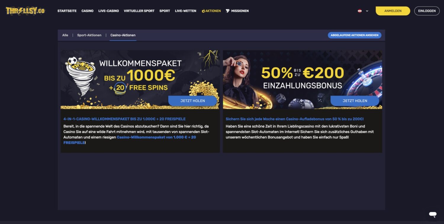 Das Willkommenspaket beginnt mit einem 100% Bonus bis zu 200€ plus 20 Freispiele bei deiner ersten Einzahlung. Um diesen Bonus zu aktivieren, musst du den Bonuscode THRILL200 verwenden. Bei der zweiten Einzahlung erhältst du einen 50% Bonus bis zu 250€ mit dem Code THRILL250. Die dritte Einzahlung bringt dir einen weiteren 50% Bonus bis zu 250€ mit dem Code THRILL50, und für die vierte Einzahlung gibt es einen großzügigen 100% Bonus bis zu 300€ mit dem Code THRILL300.