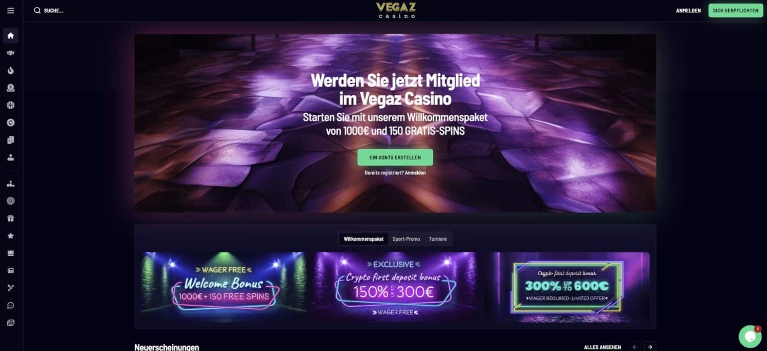 Besonders herausragend ist jedoch das großzügige Willkommenspaket, denn es bietet 250% bis zu 1.000€ plus 150 Freispiele. Das Besondere daran ist, dass diese komplett ohne Umsatzbedingungen daherkommen, was in der Casino-Welt tatsächlich eine echte Seltenheit darstellt. Zudem stellt das Vegaz Casino vielfältige Ein- und Auszahlungsmethoden bereit, sodass du sowohl klassische Optionen wie Kreditkarten als auch zahlreiche Kryptowährungen nutzen kannst. Darüber hinaus ist der Kundensupport rund um die Uhr erreichbar, während das durchdachte VIP-Programm das Angebot perfekt abrundet und für langfristige Spielfreude sorgt.