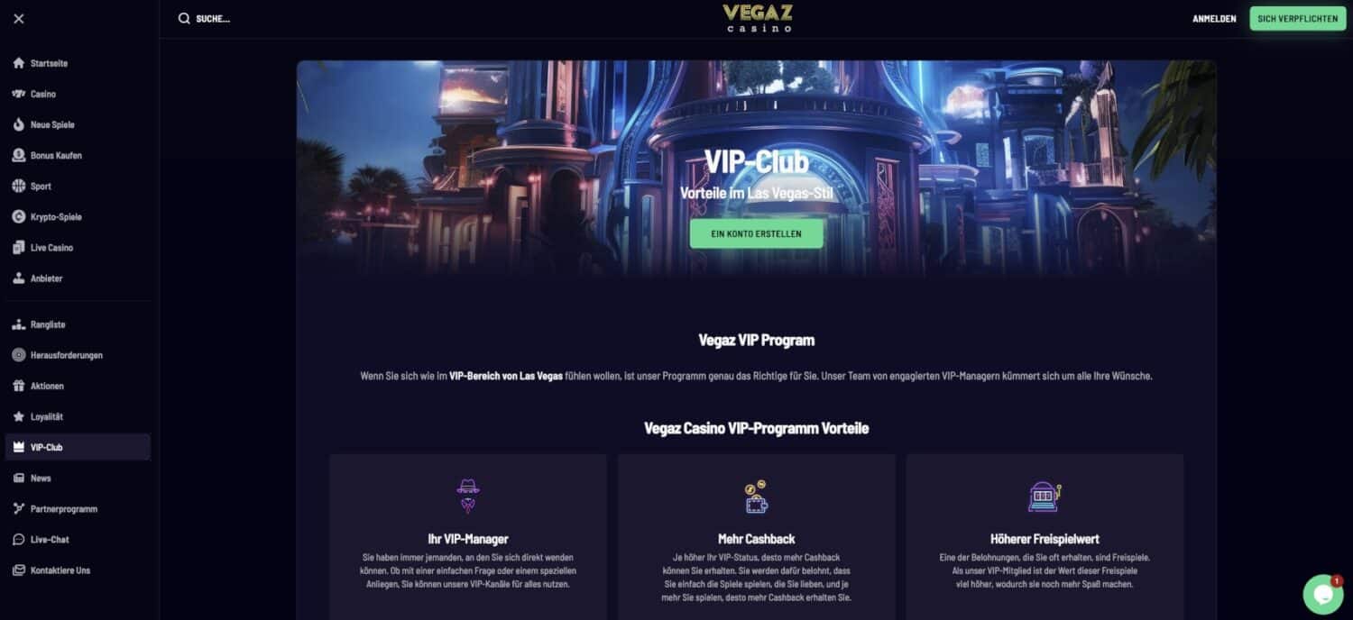 Das Vegaz Casino bietet ein exklusives VIP-Programm, das treue Spieler mit zahlreichen Vorteilen belohnt. Dabei ist ein echtes Las-Vegas-ähnliches Premium-Erlebnis das Ziel, während ein Team engagierter VIP-Manager sich um alle Wünsche kümmert. Als VIP-Spieler erhältst du außerdem einen persönlichen Ansprechpartner, der dir bei Fragen oder speziellen Anliegen direkt zur Verfügung steht. Dieser Service macht somit den entscheidenden Unterschied zwischen Standard- und Premium-Erfahrung aus.
