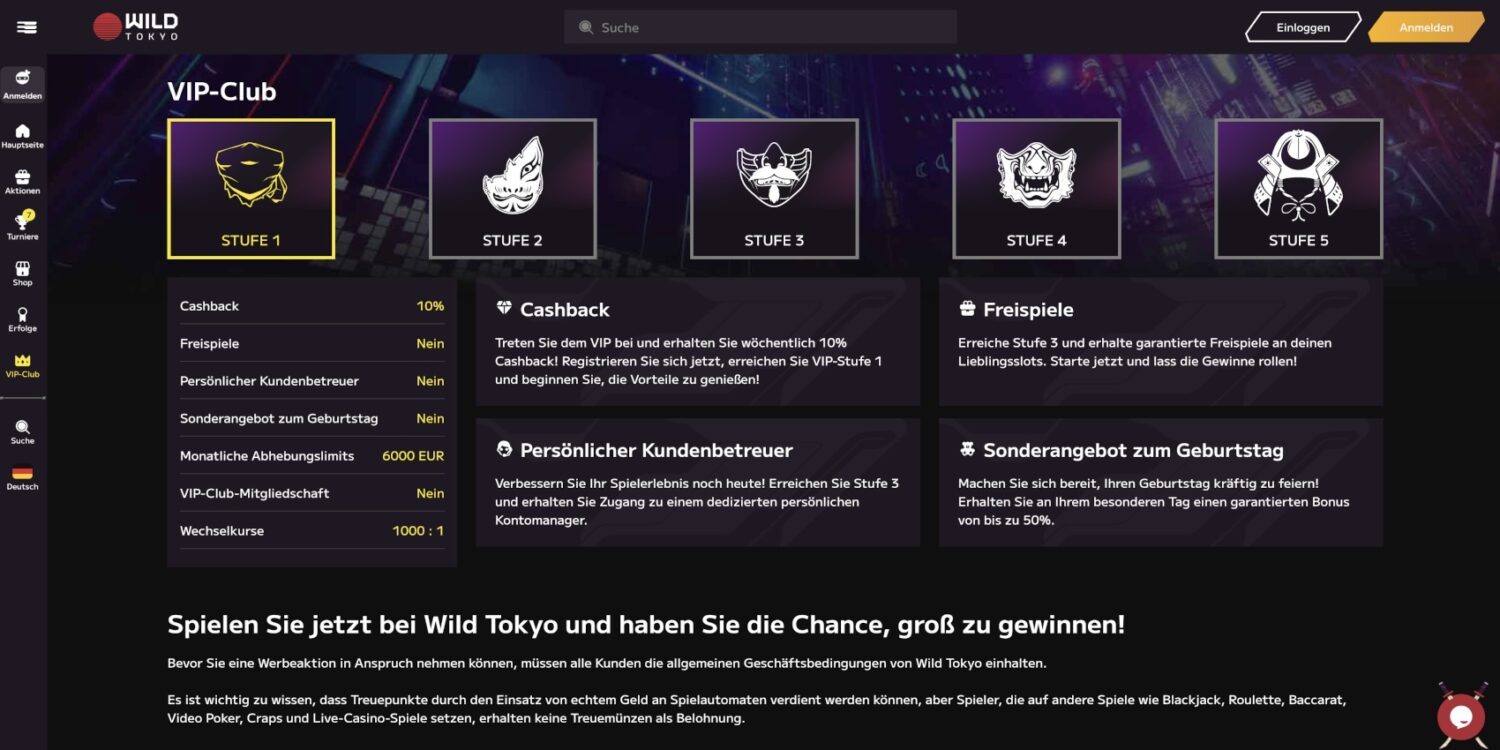 Das Wild Tokyo Casino belohnt loyale Spieler mit einem attraktiven VIP-Programm, das über fünf Stufen hinweg exklusive Vorteile bietet. Bereits ab der ersten Stufe profitierst du von einem wöchentlichen Cashback in Höhe von 10% auf deine Verluste. Mit steigendem Level erhöhen sich die Vorteile kontinuierlich, sodass sich regelmäßiges Spielen in diesem Online Casino tatsächlich auszahlt. Das Programm gestaltet sich transparent, und du kannst jederzeit deinen aktuellen Status und die nächsten erreichbaren Meilensteine einsehen.