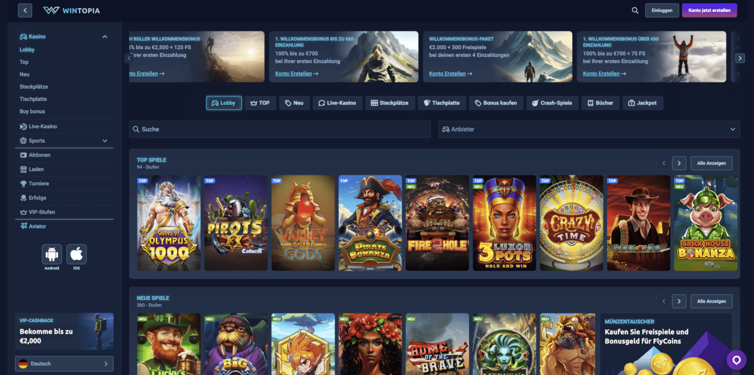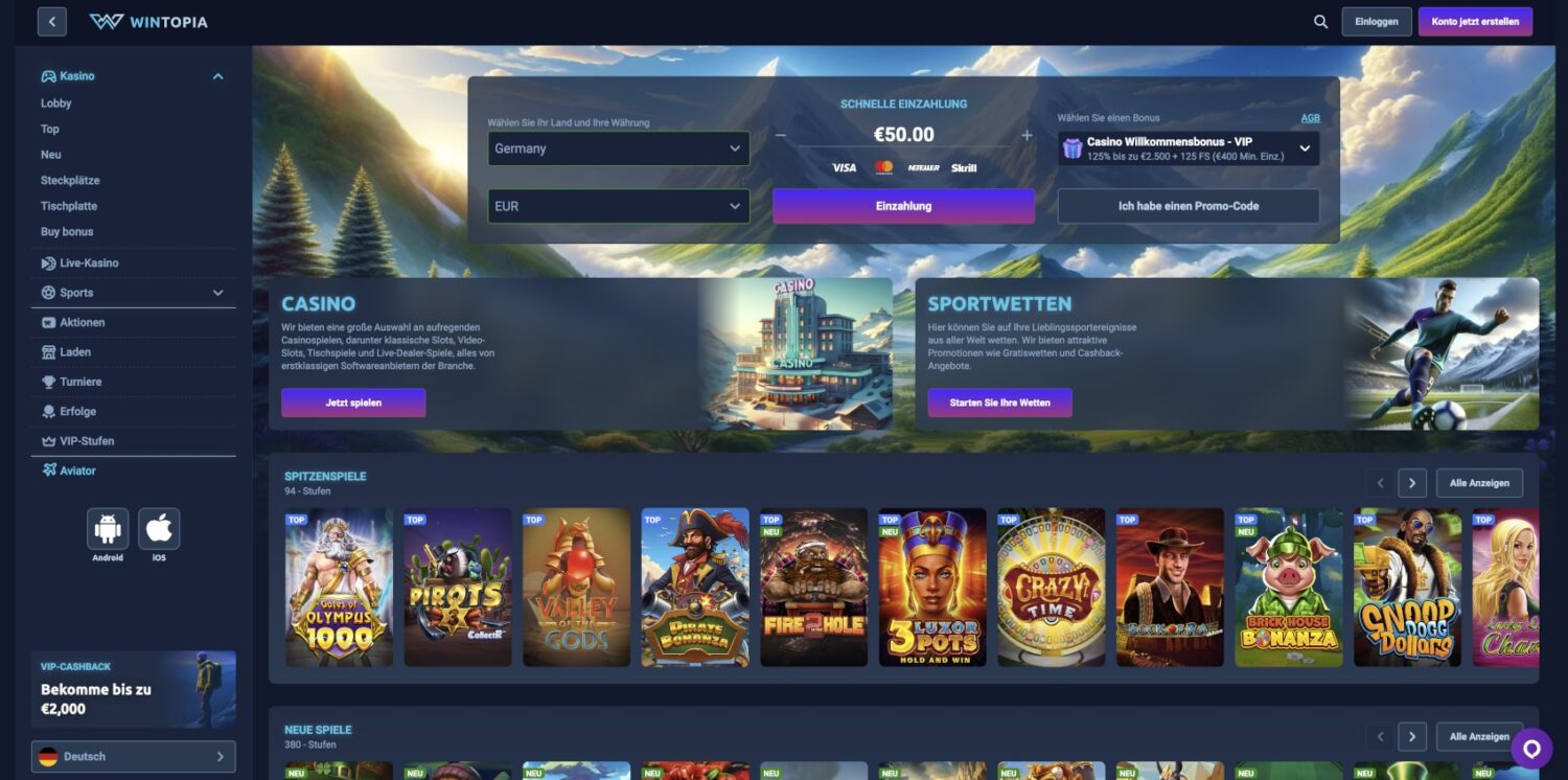 Das Wintopia Casino macht auf den ersten Blick einen modernen und benutzerfreundlichen Eindruck. Die Webseite besticht durch ihr klares Design und die intuitive Navigation, die es dir ermöglicht, schnell zu deinen Lieblingsspielen zu gelangen. Besonders auffällig ist die große Auswahl an Spielen von namhaften Entwicklern, die das Casino ohne LUGAS zu einem interessanten Anlaufpunkt für Spieler aller Vorlieben macht. Die Plattform lädt schnell und reagiert flüssig auf Eingaben, was besonders bei längeren Spielsessions einen angenehmen Unterschied ausmacht. Auch das Farbschema und die Gestaltung wirken durchdacht und professionell, ohne dabei überladen zu wirken.