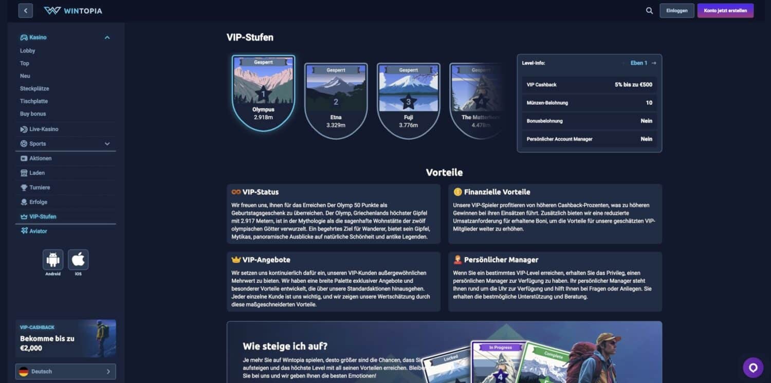 Das Wintopia Casino strukturiert sein VIP-Programm entlang einer „Bergbesteigung“, wobei jede Stufe nach einem berühmten Berg benannt ist und spezifische Vorteile bietet: