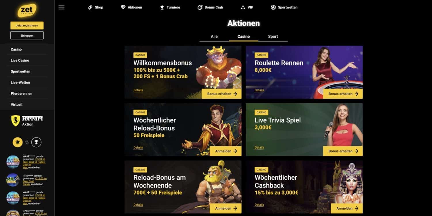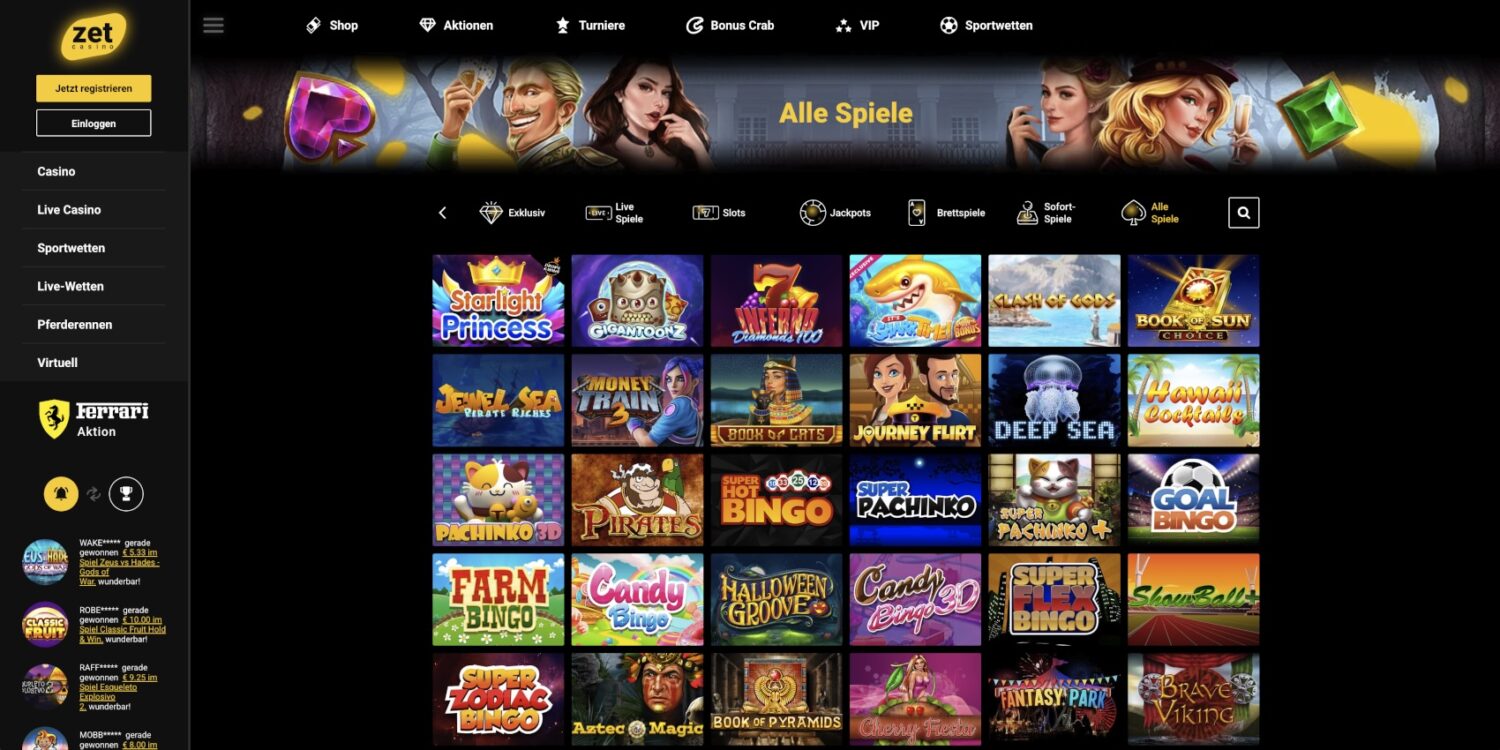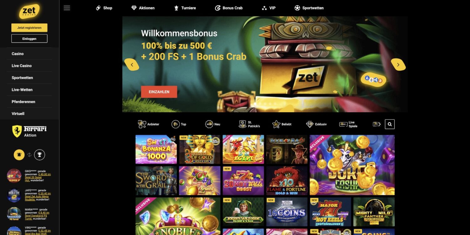 Die Spielauswahl im ZetCasino Casino wird durch praktische Filterfunktionen wie „Neu“, „Top“, „Beliebt“ und „Exklusiv“ strukturiert, was die Navigation durch das riesige Angebot vereinfacht. Besonders auffällig sind die großzügigen Promotionen im online Casinos ohne OASIS, wie beispielsweise das Gewinnspiel mit einem Ferrari 488 Spider als Hauptpreis. Ein interessantes Feature ist die Live-Gewinn-Anzeige am Seitenrand, die aktuelle Gewinne anderer Spieler in Echtzeit präsentiert und so für zusätzliche Spannung sorgt. Die Spielkacheln selbst sind mit aussagekräftigen Vorschaubildern gestaltet und tragen farbige Markierungen für neue oder exklusive Titel.
